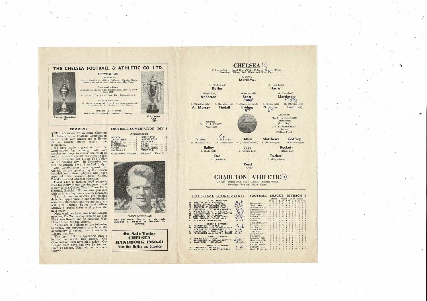 Chelsea v Charlton Athletic Football Combination Programme 1960/61