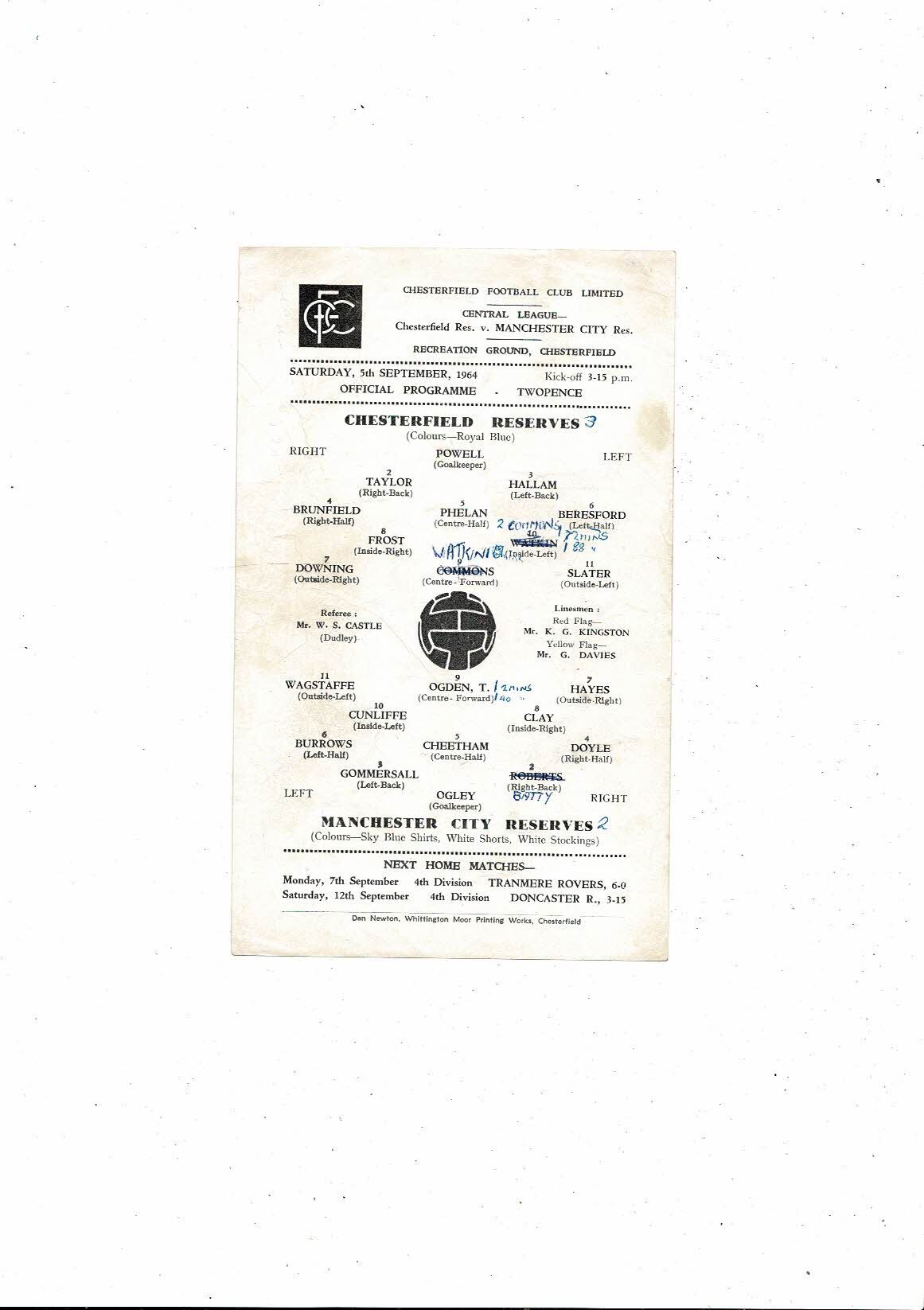 Chesterfield v Manchester City Central League Football Programme 1964/65