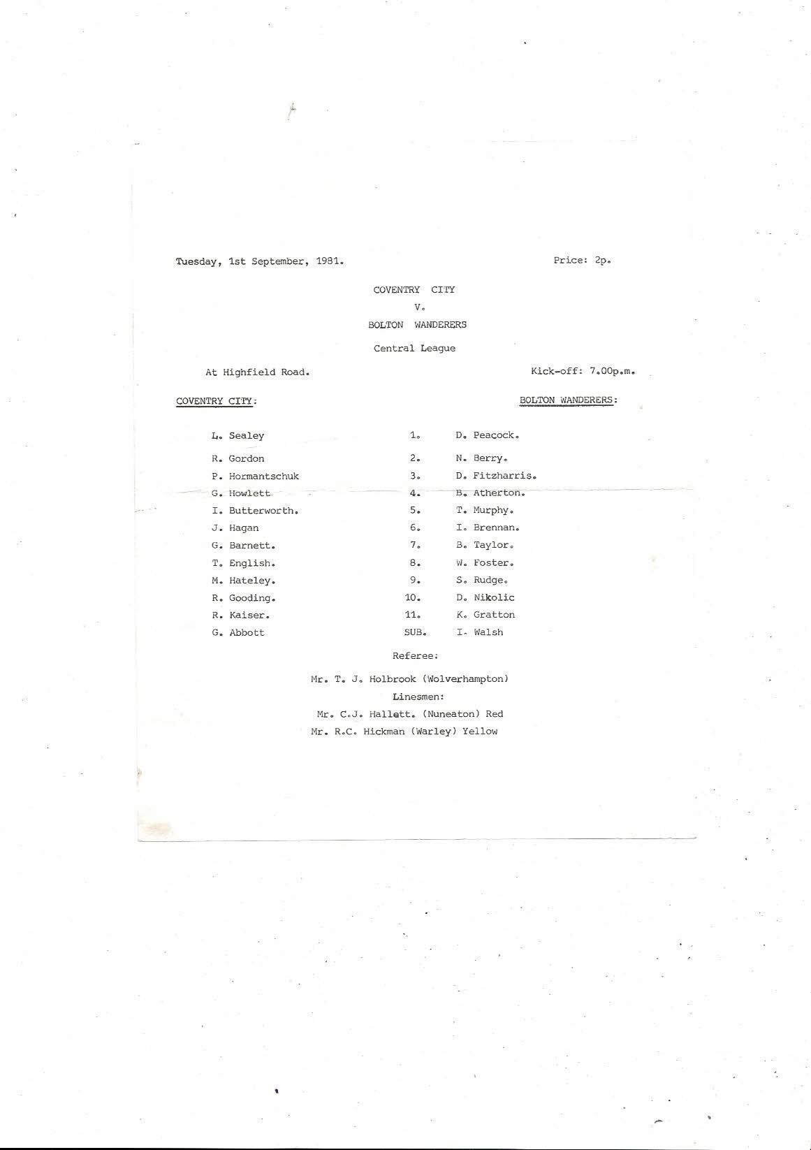 Coventry City v Bolton Wanderers Central League Football Programme 1981/82