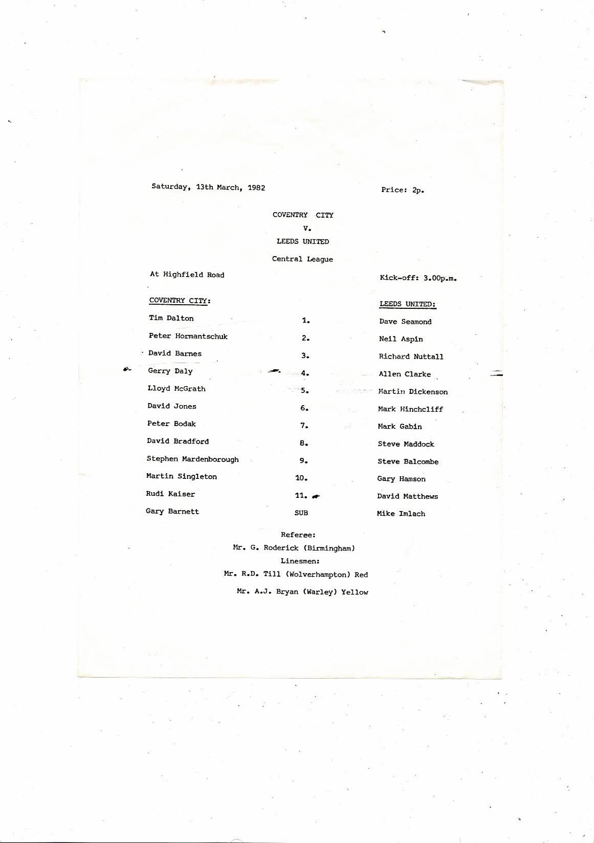 Coventry City v Leeds United Central League Football Programme 1981/82