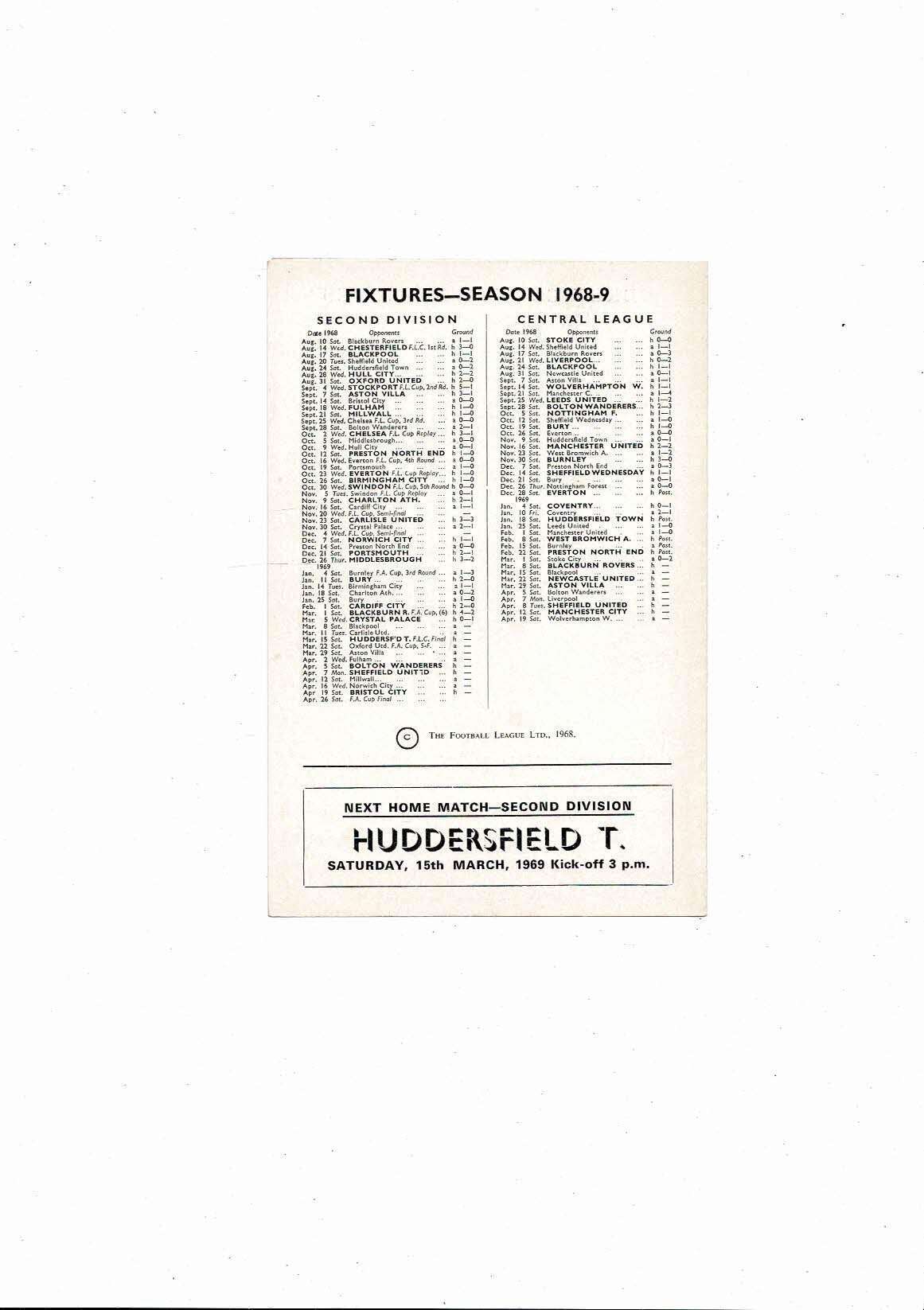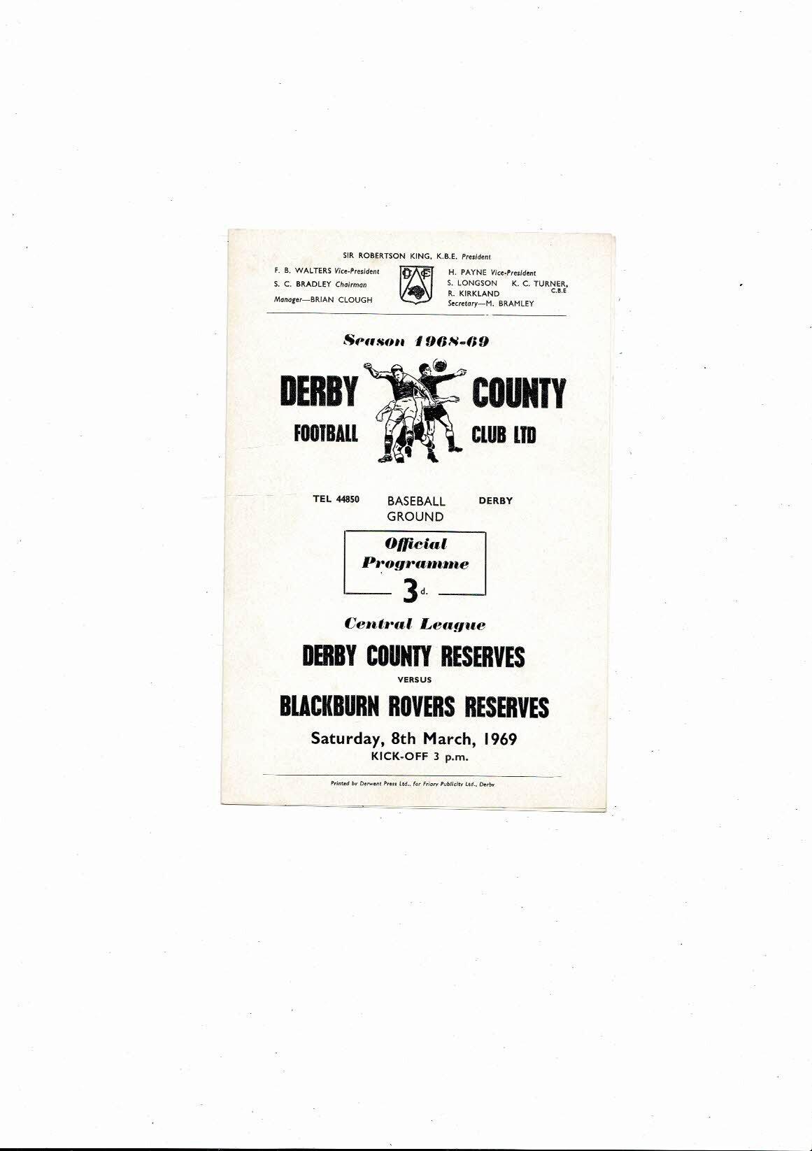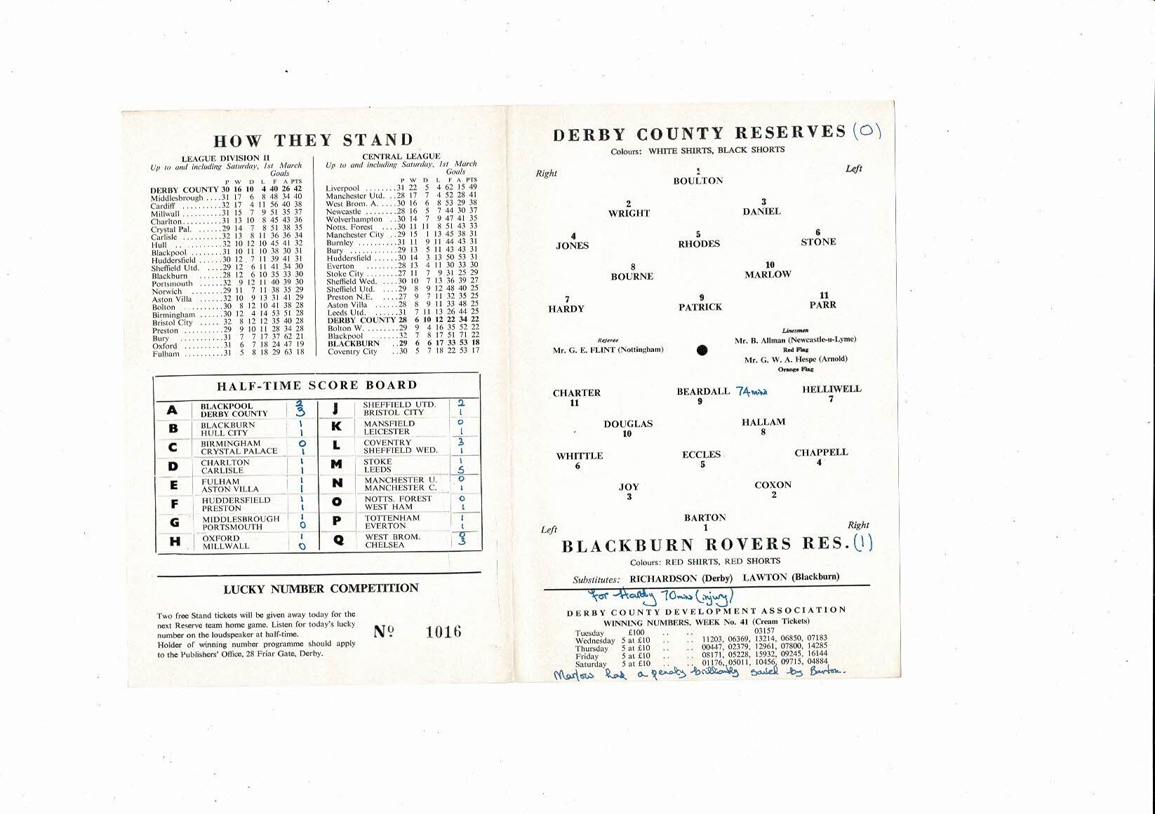 Derby County v Blackburn Rovers Central League Football Programme 1968/69