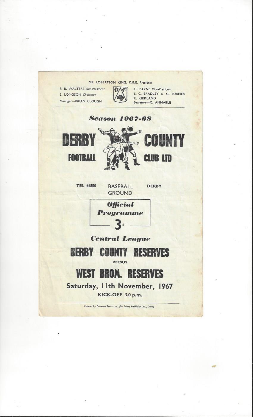 Derby County v West Bromwich Albion Central League Football Programme 1967/68