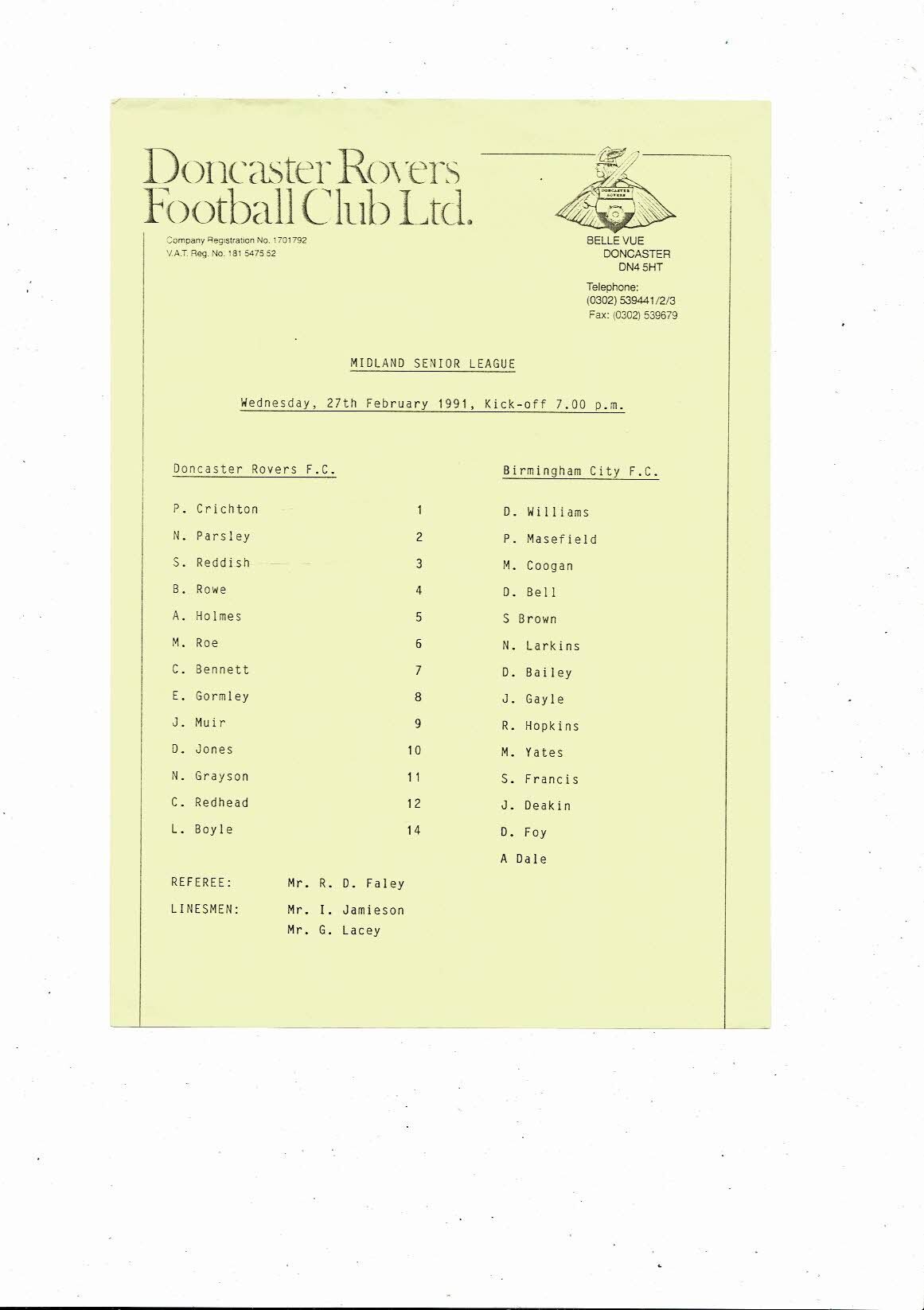 Doncaster Rovers v Birmingham City Midland Snr League Football Programme 1990/91