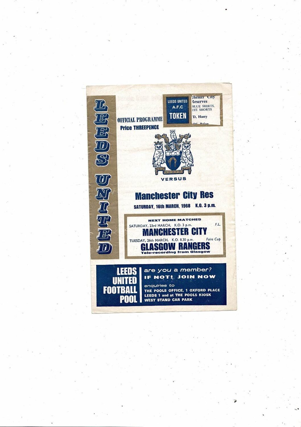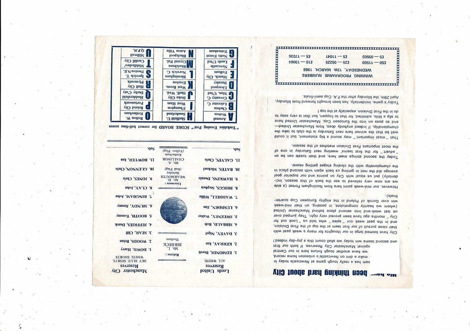 Leeds United v Manchester City Central League Football Programme 1967/68 March