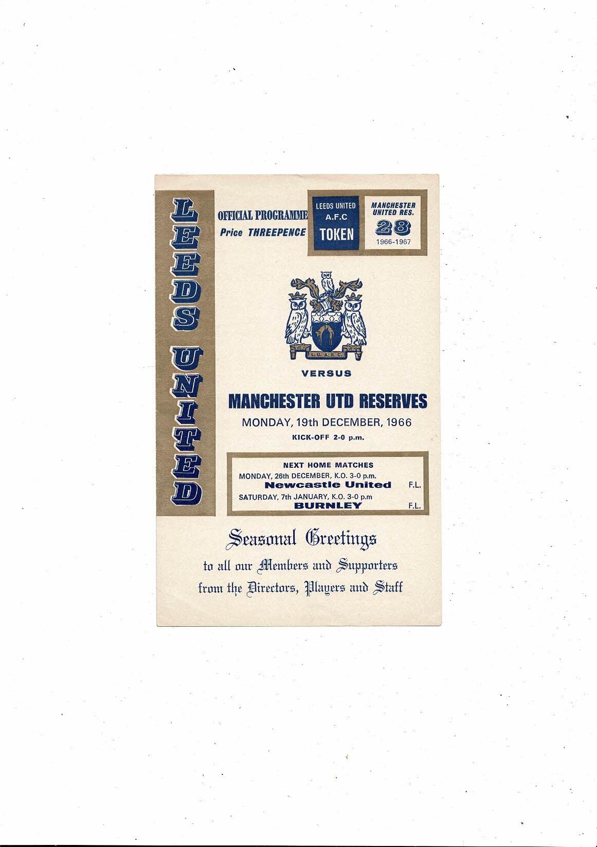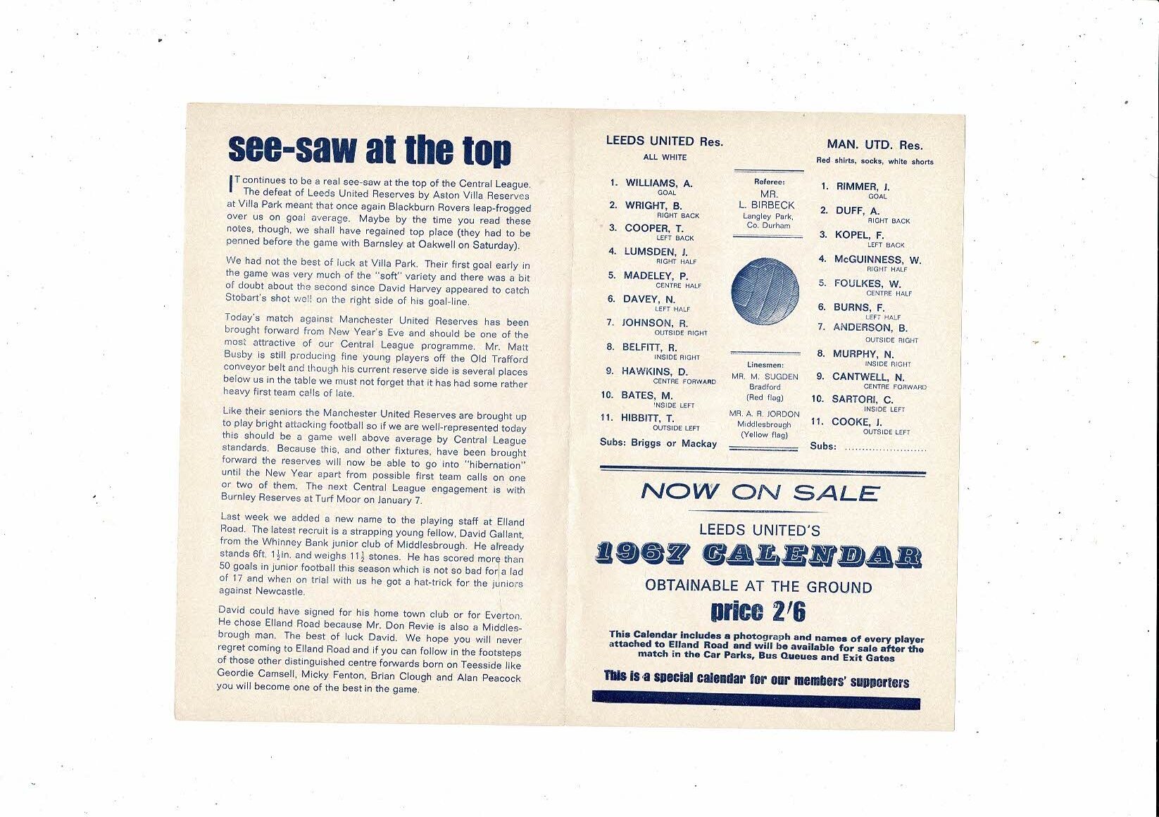 Leeds United v Manchester United Central League Football Programme 1966/67 19th December