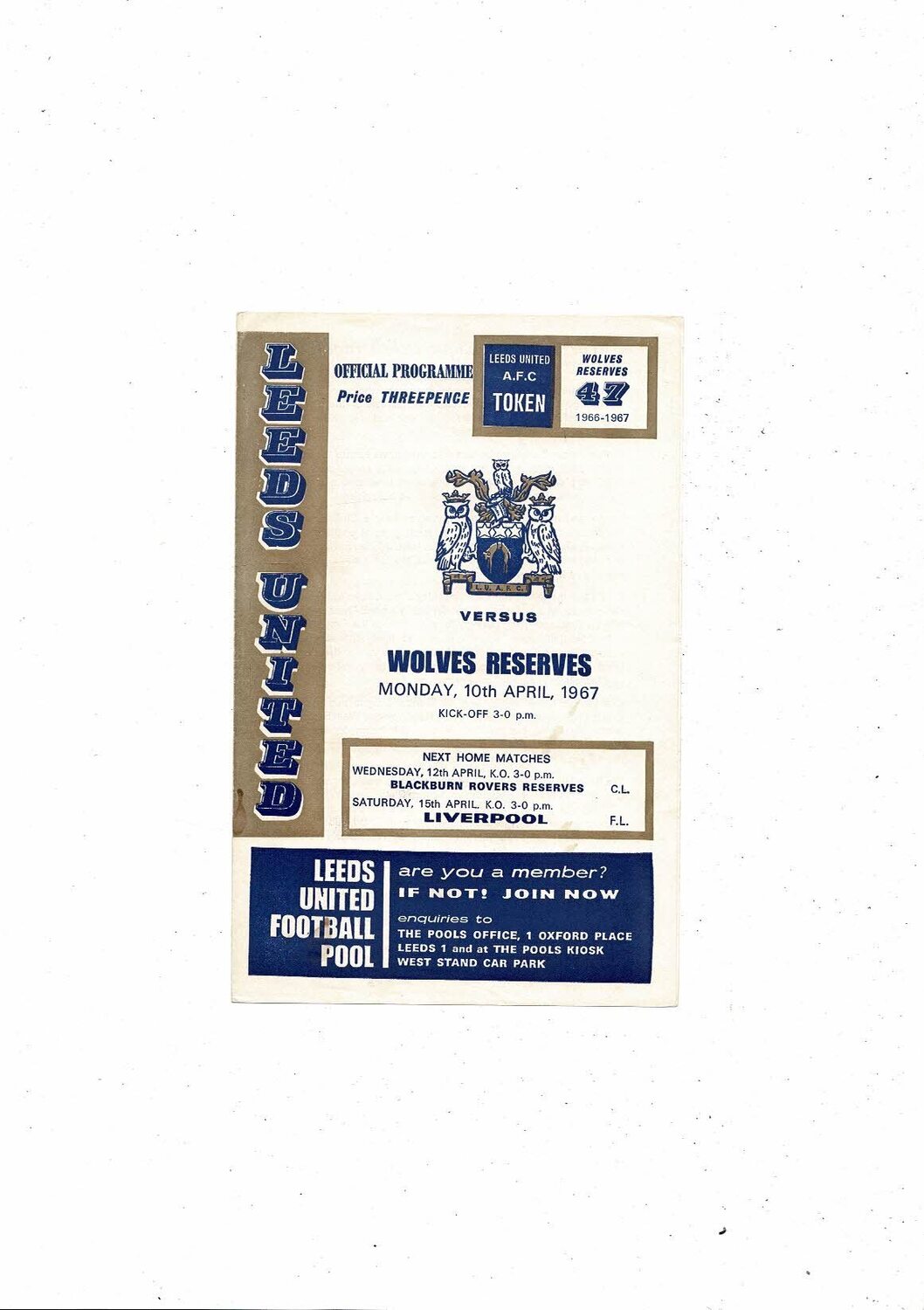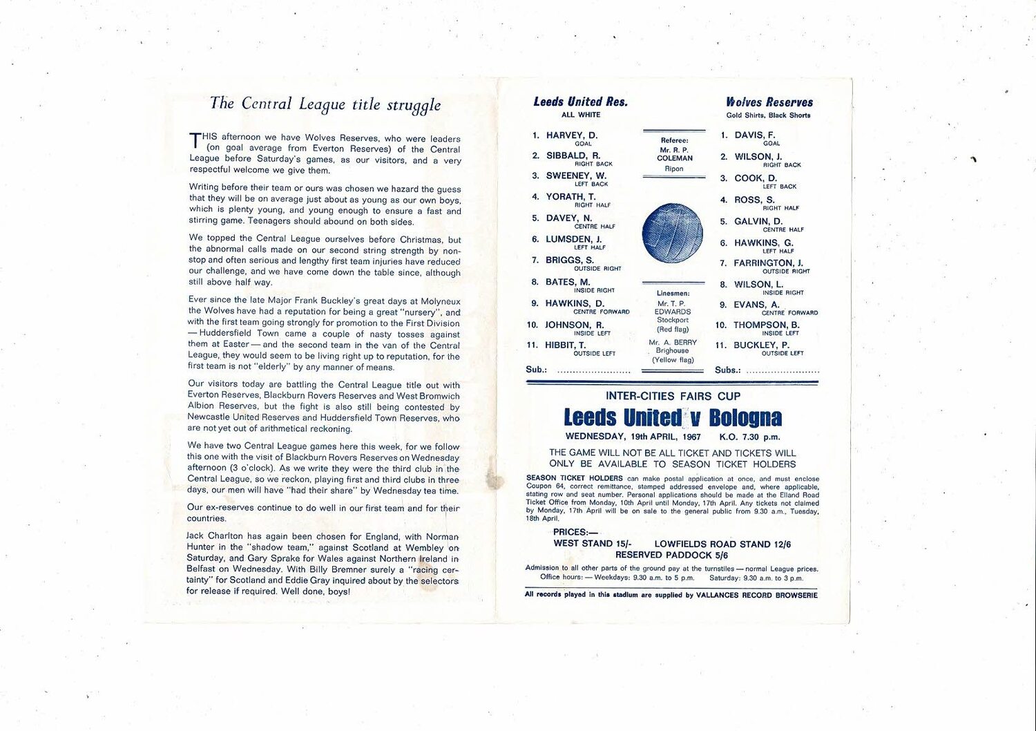 Leeds United v Wolves Central League Football Programme 1966/67