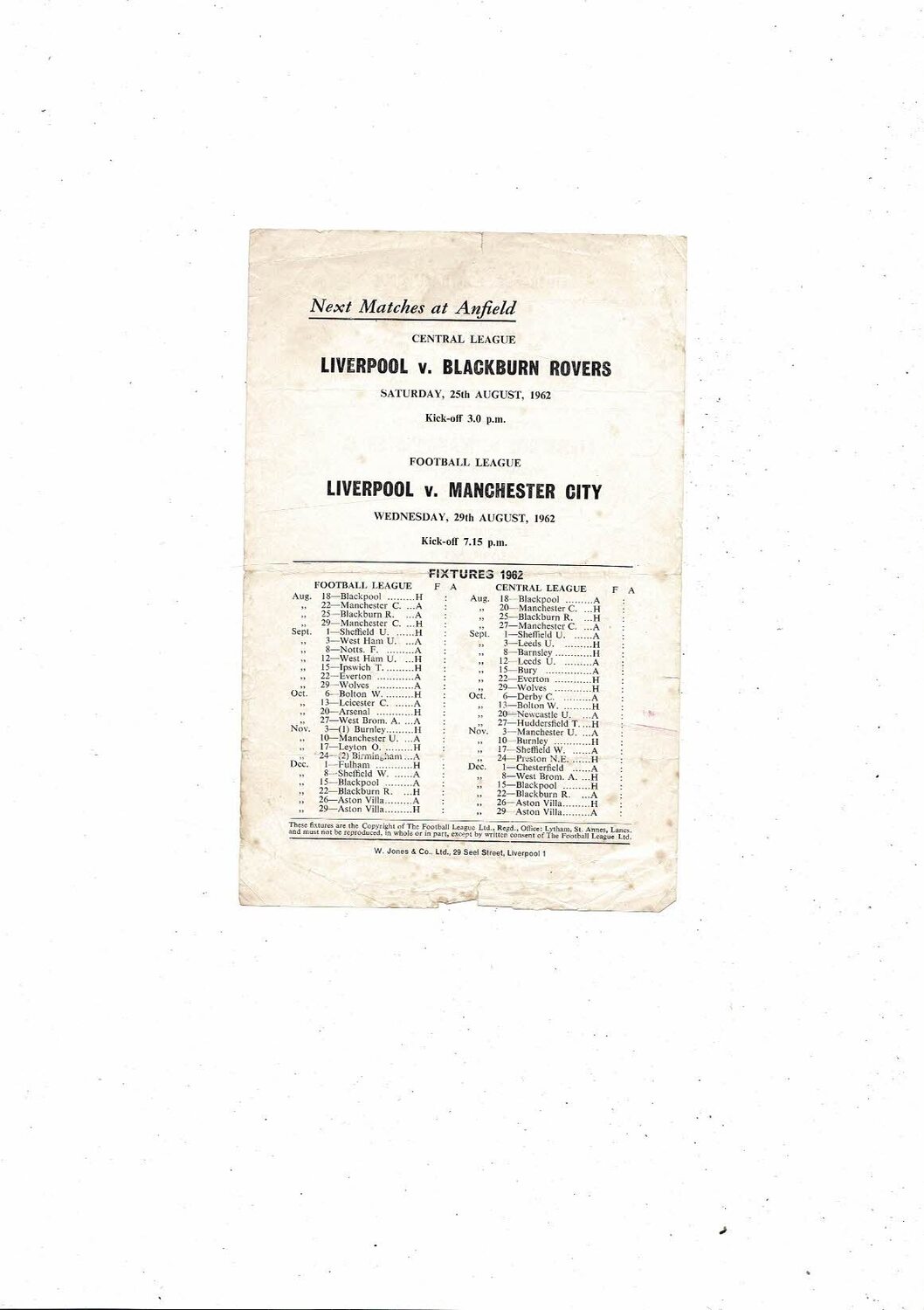 Liverpool v Manchester City Central League Football Programme 1962/63