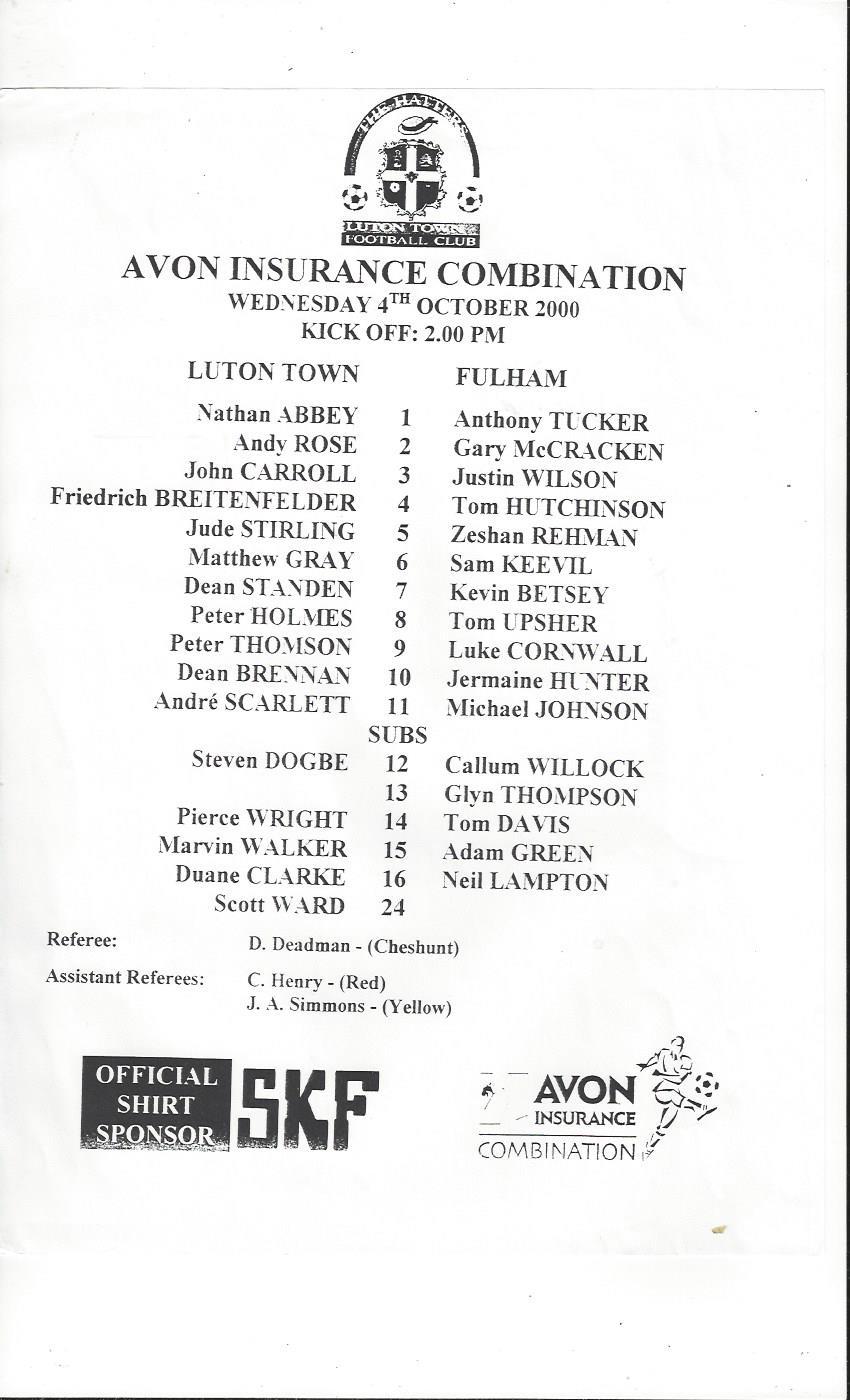 Luton Town v Fulham Reserves Football Programme 2000/01