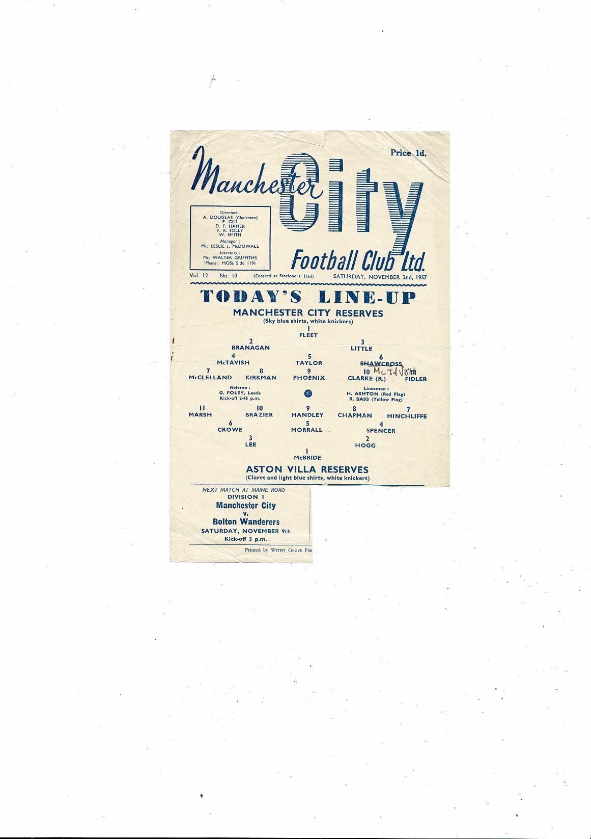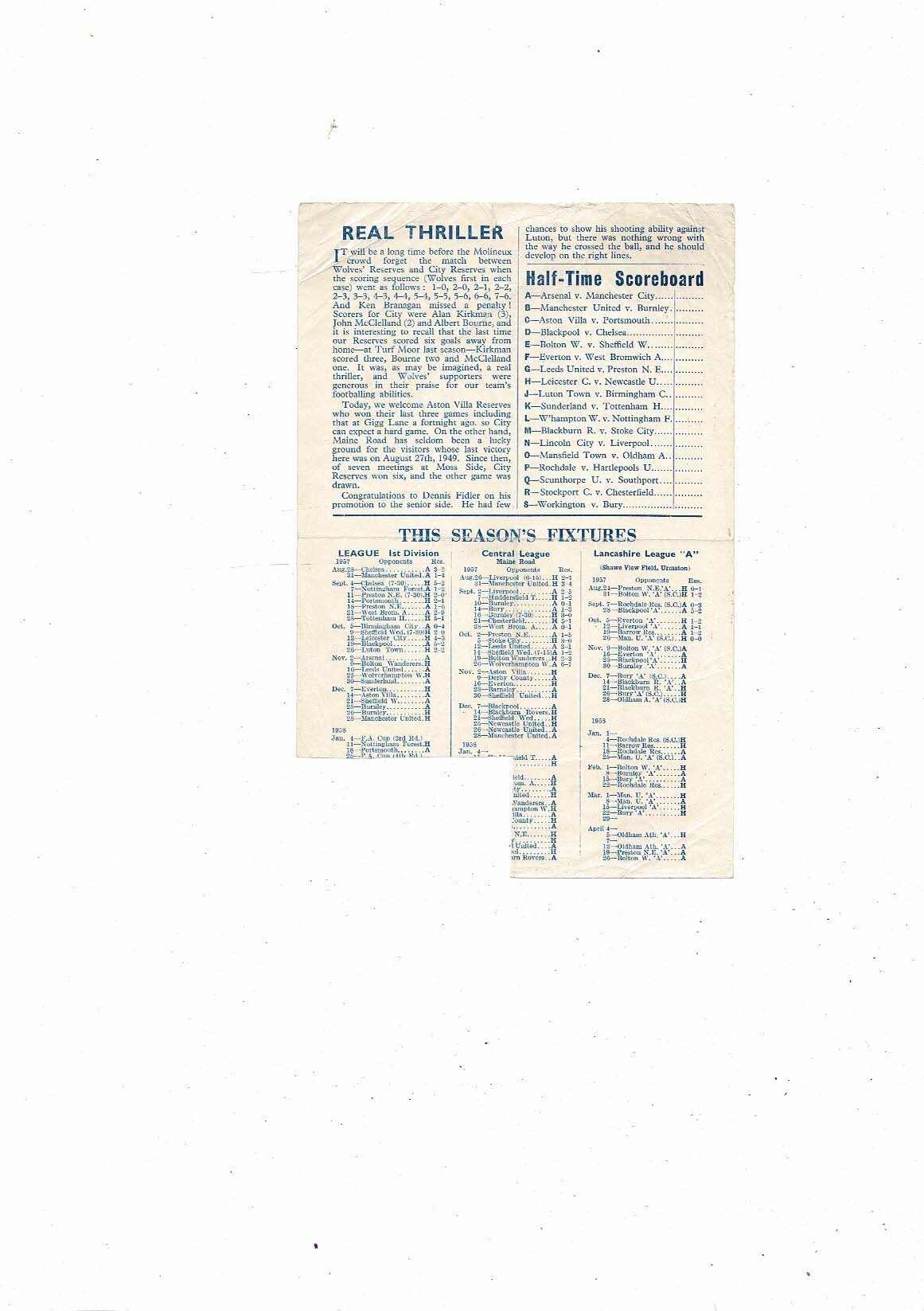 Manchester City v Aston Villa Central League Football Programme 1957/58
