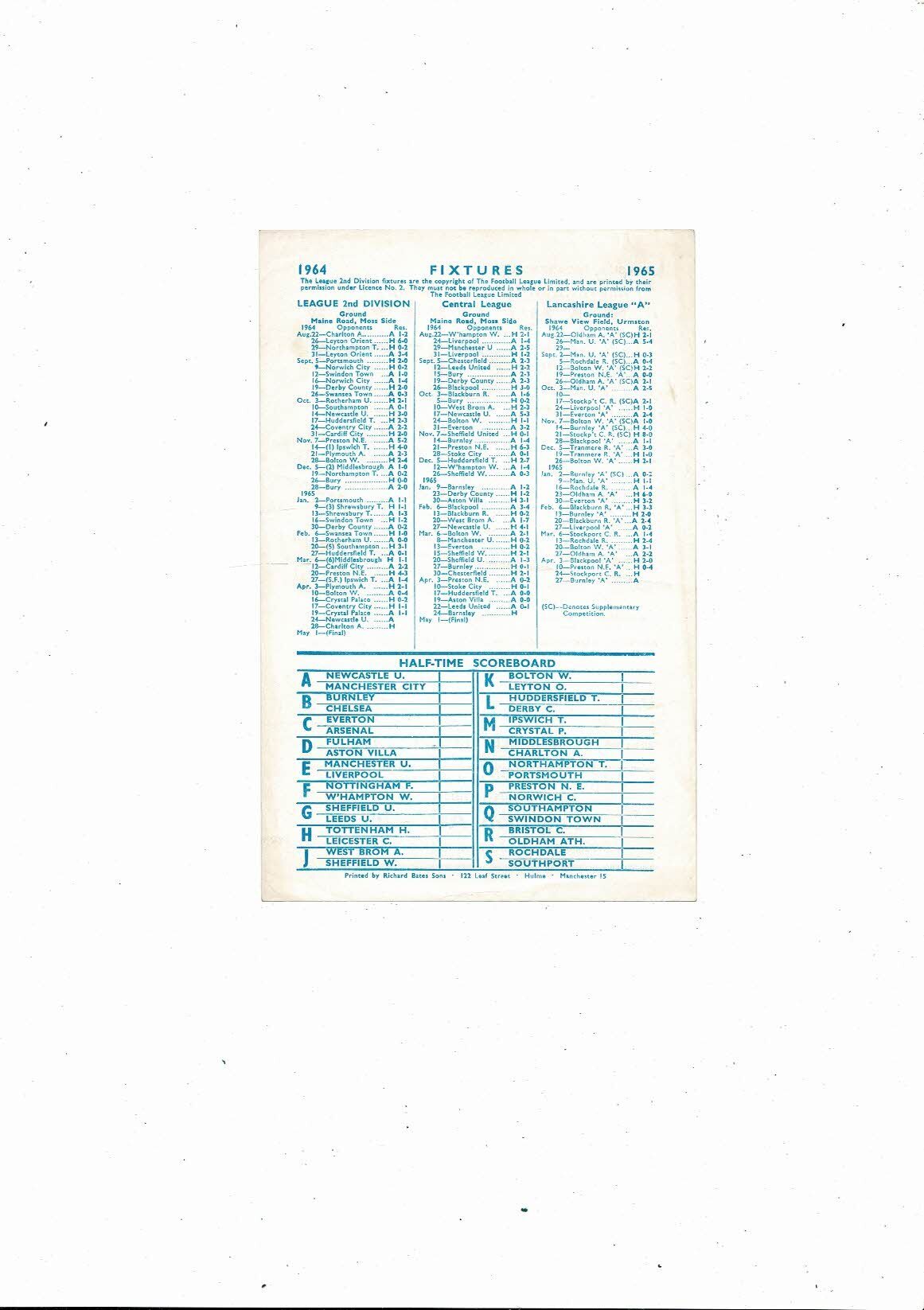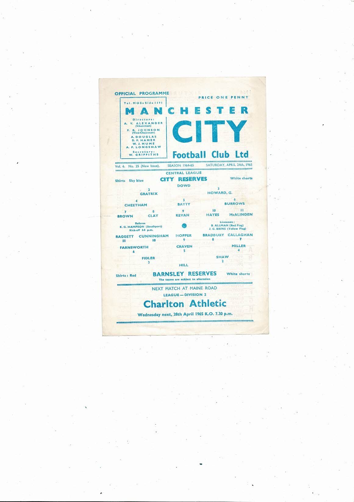 Manchester City v Barnsley Central League Football Programme 1964/65
