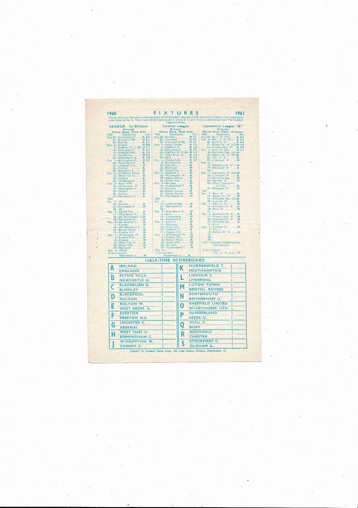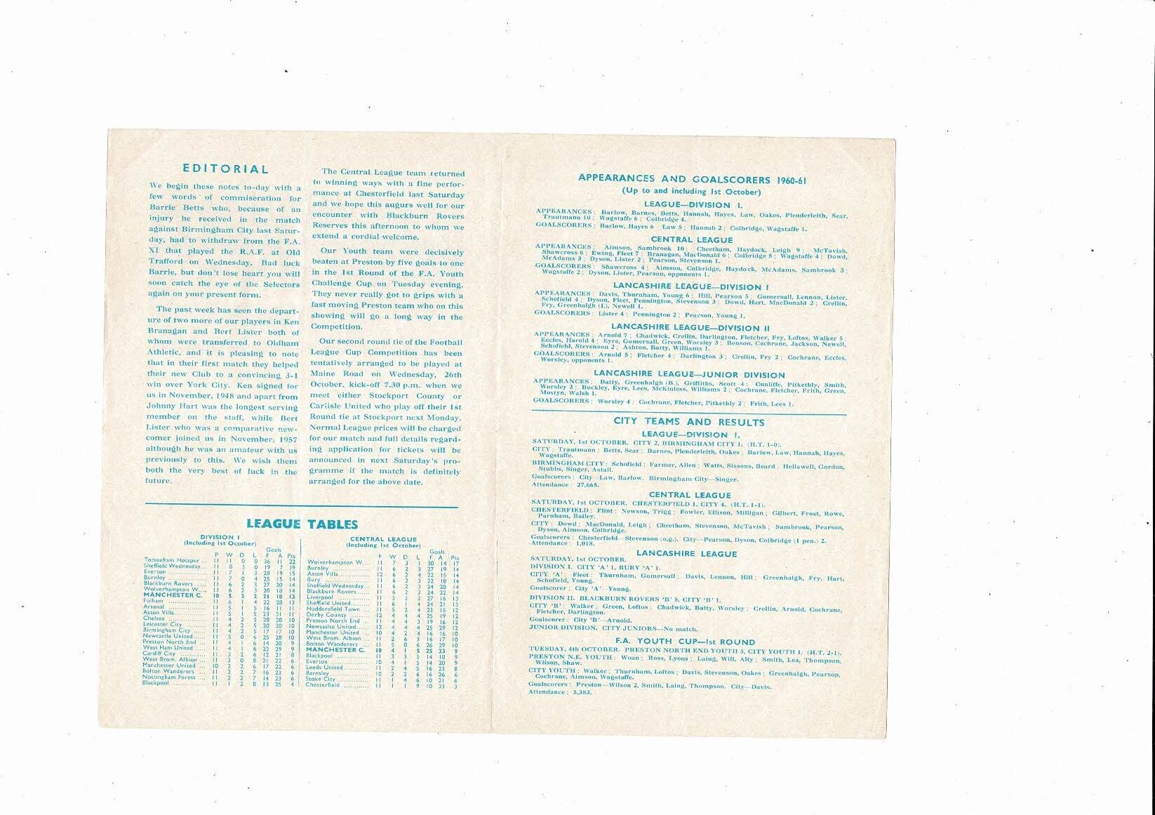 Manchester City v Blackburn Rovers Central League Football Programme 1960/61