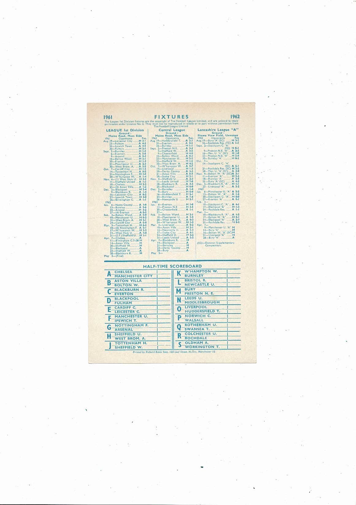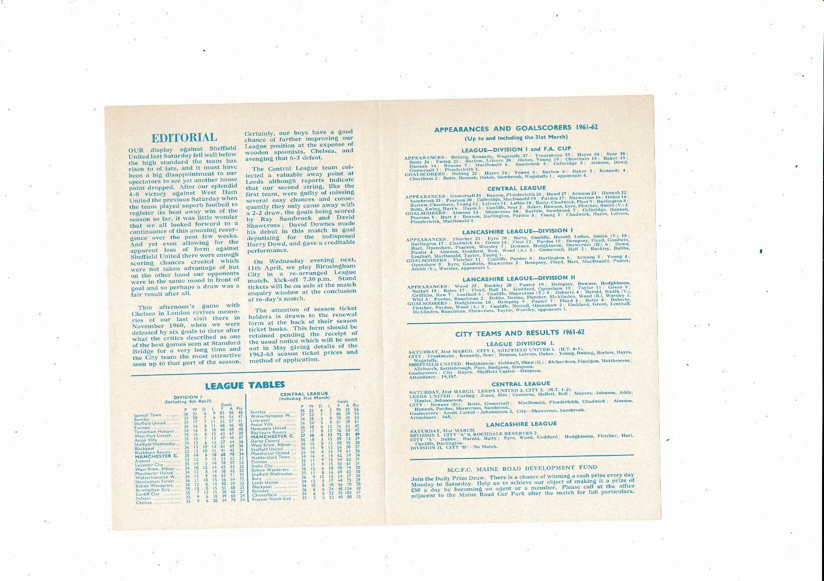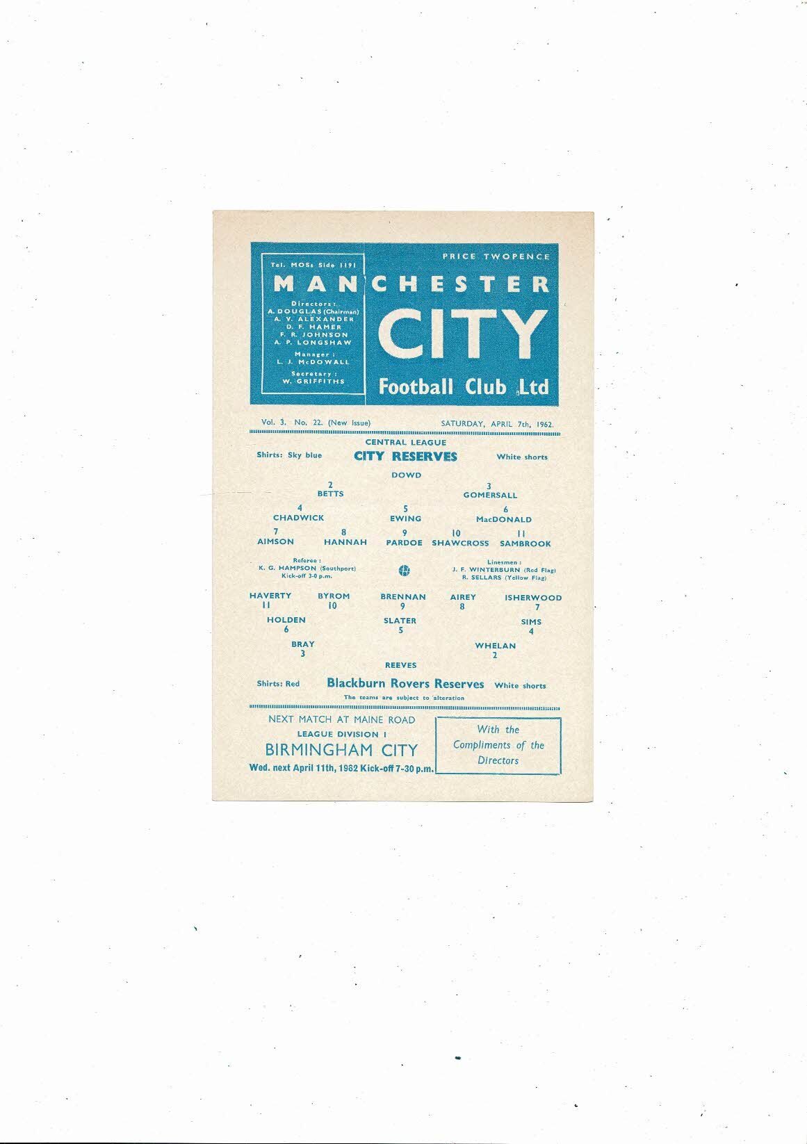 Manchester City v Blackburn Rovers Central League Football Programme 1961/62