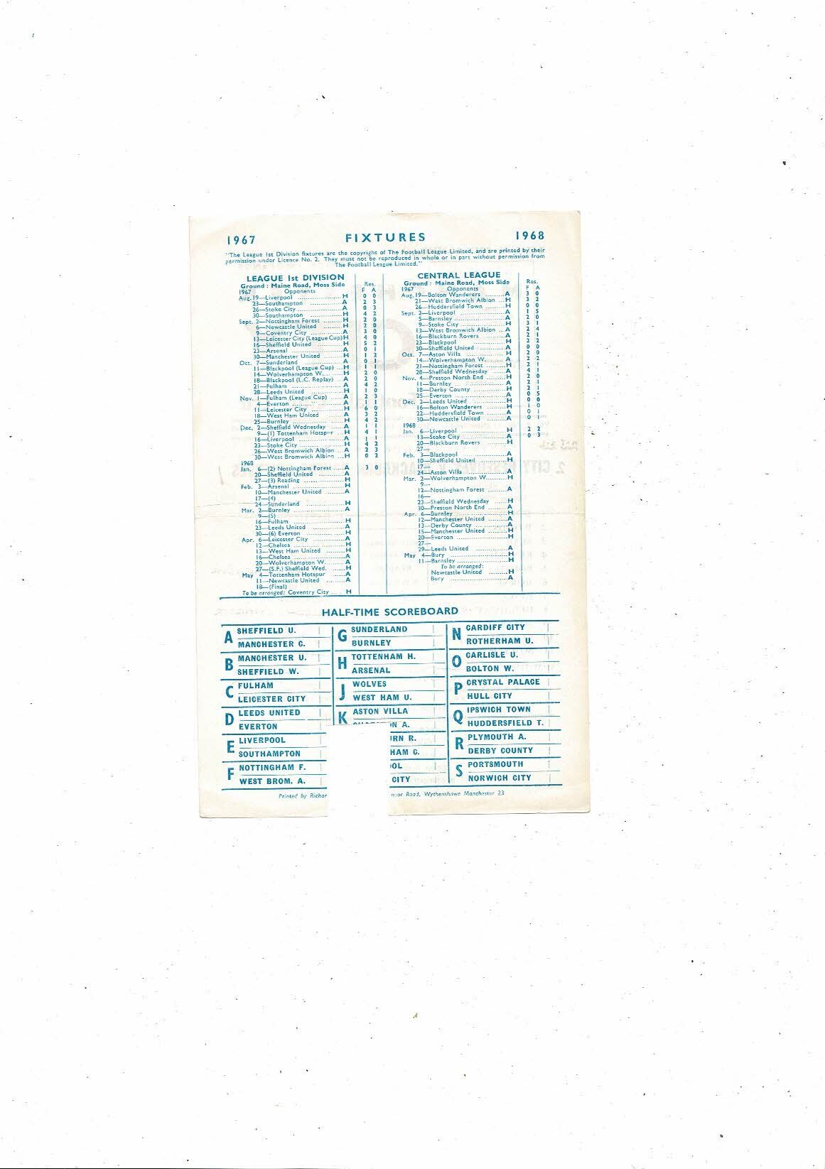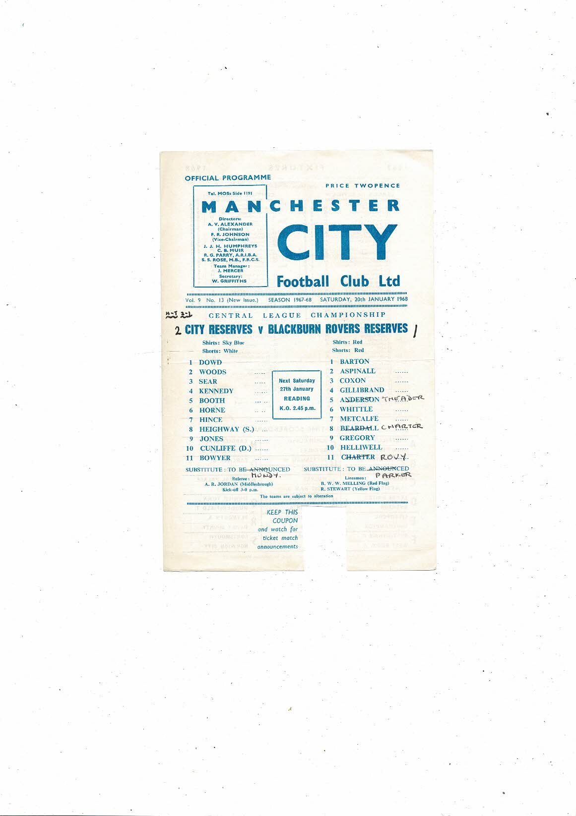 Manchester City v Blackburn Rovers Central League Football Programme 1967/68