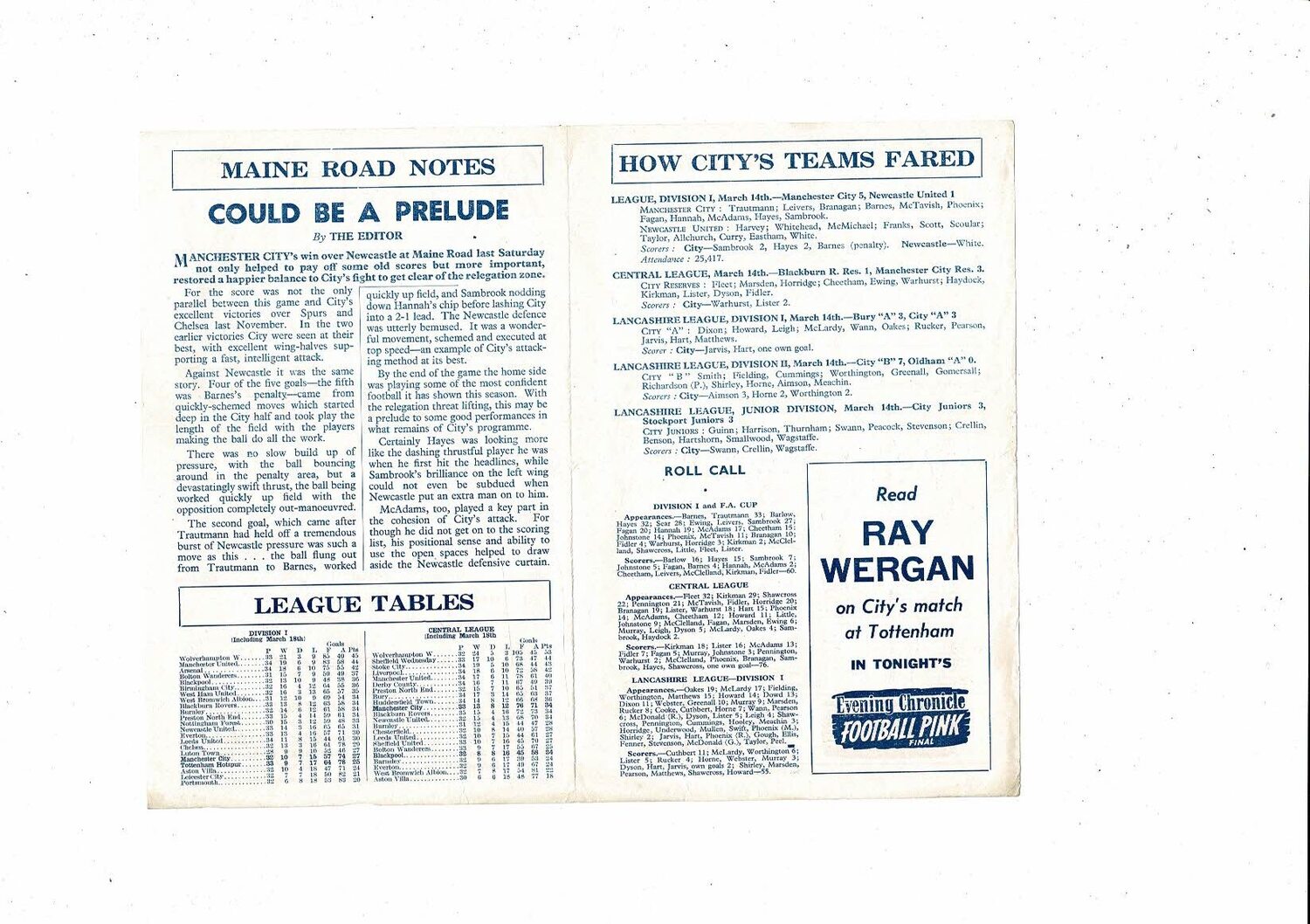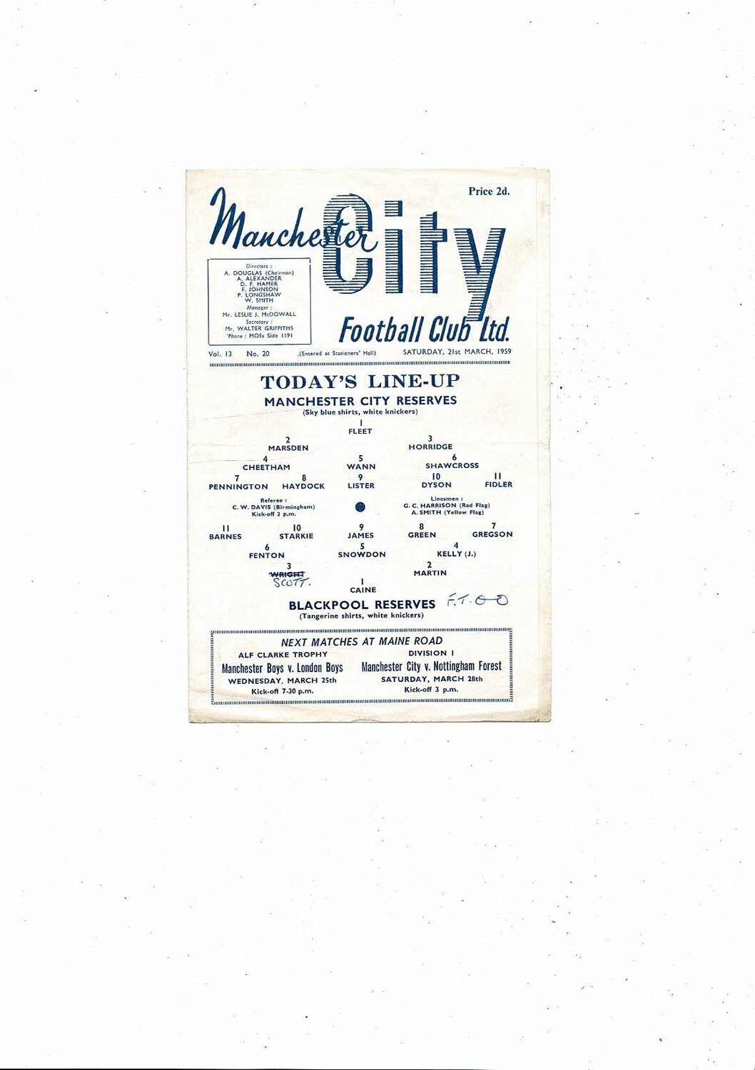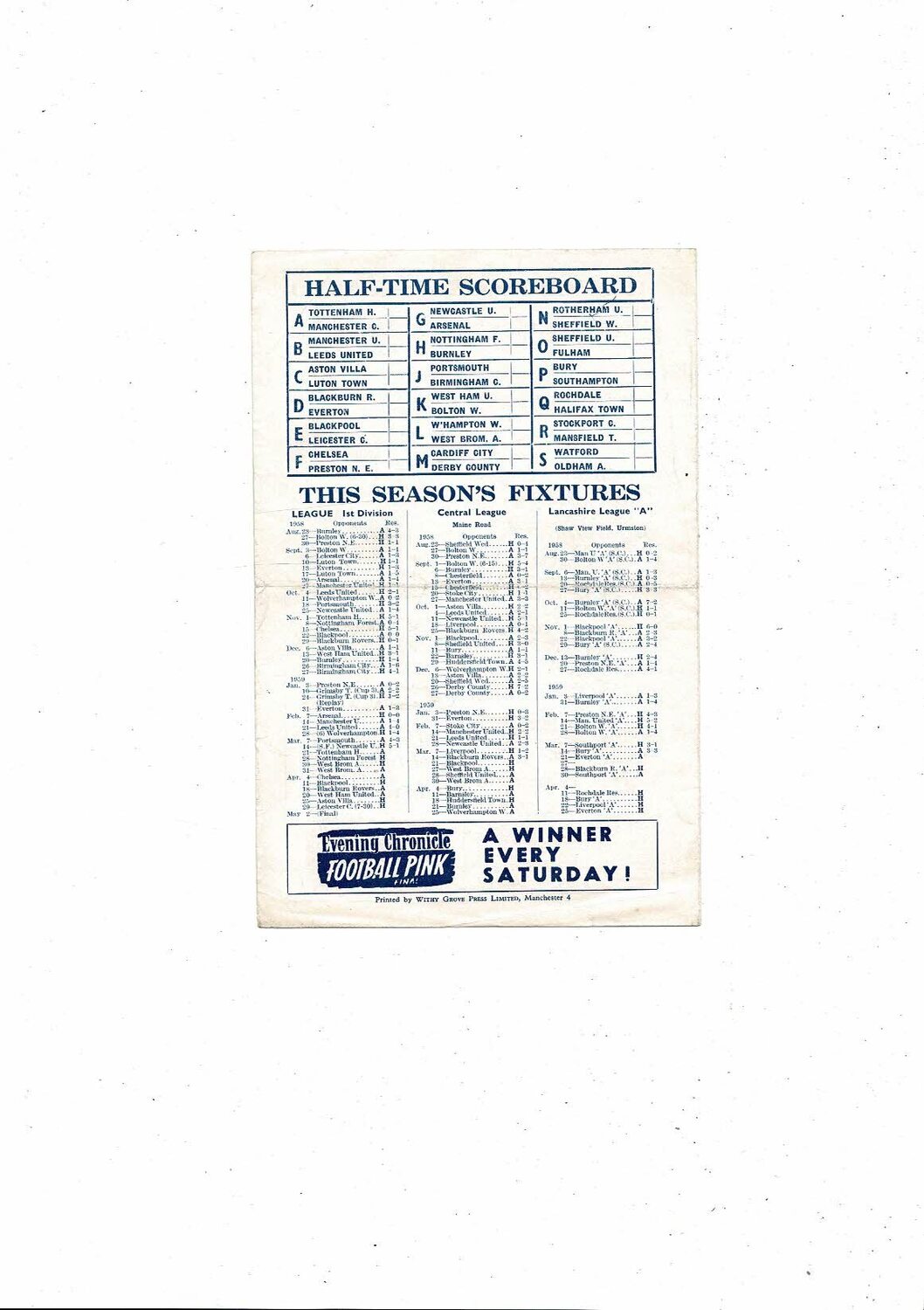 Manchester City v Blackpool Central League Football Programme 1958/59
