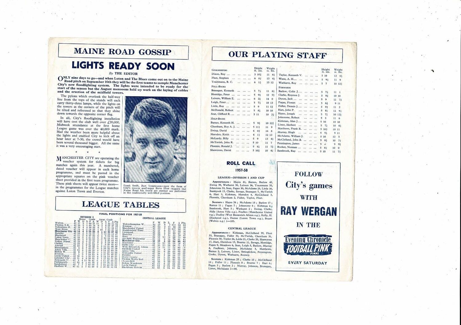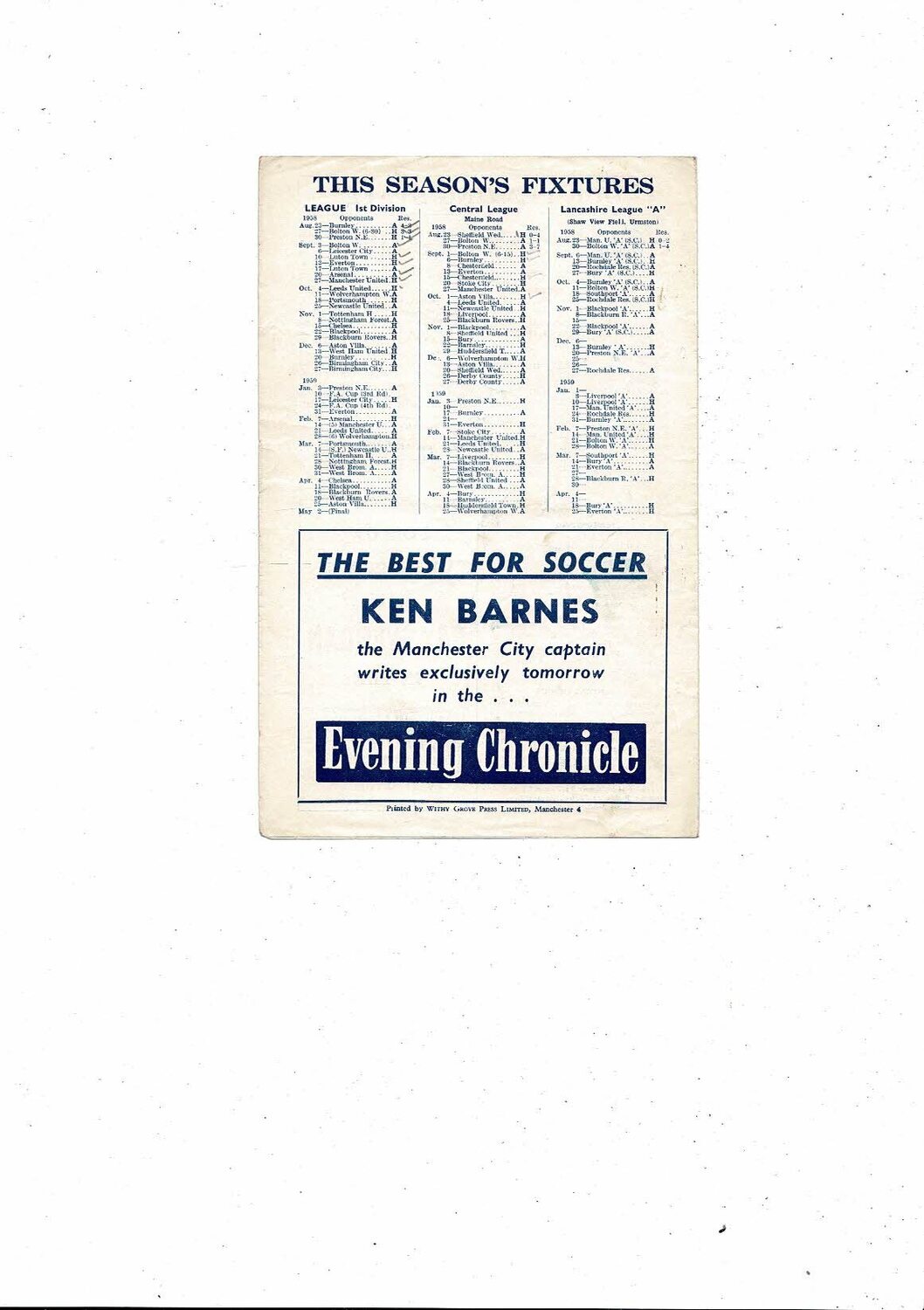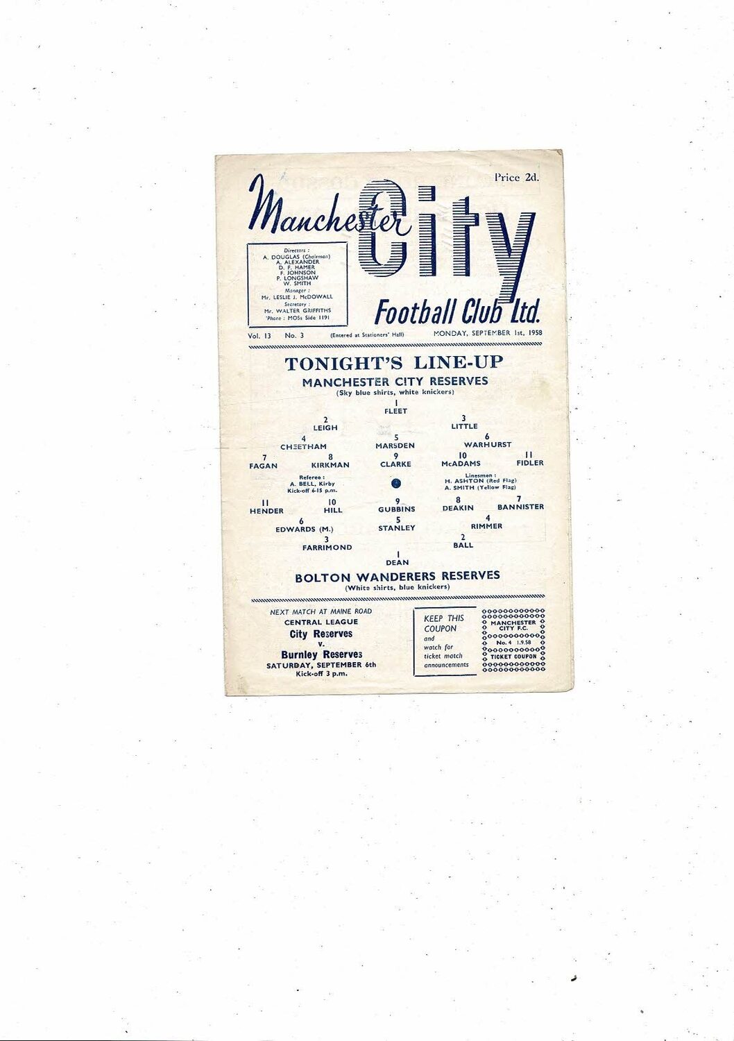 Manchester City v Bolton Wanderers Central League Football Programme 1958/59