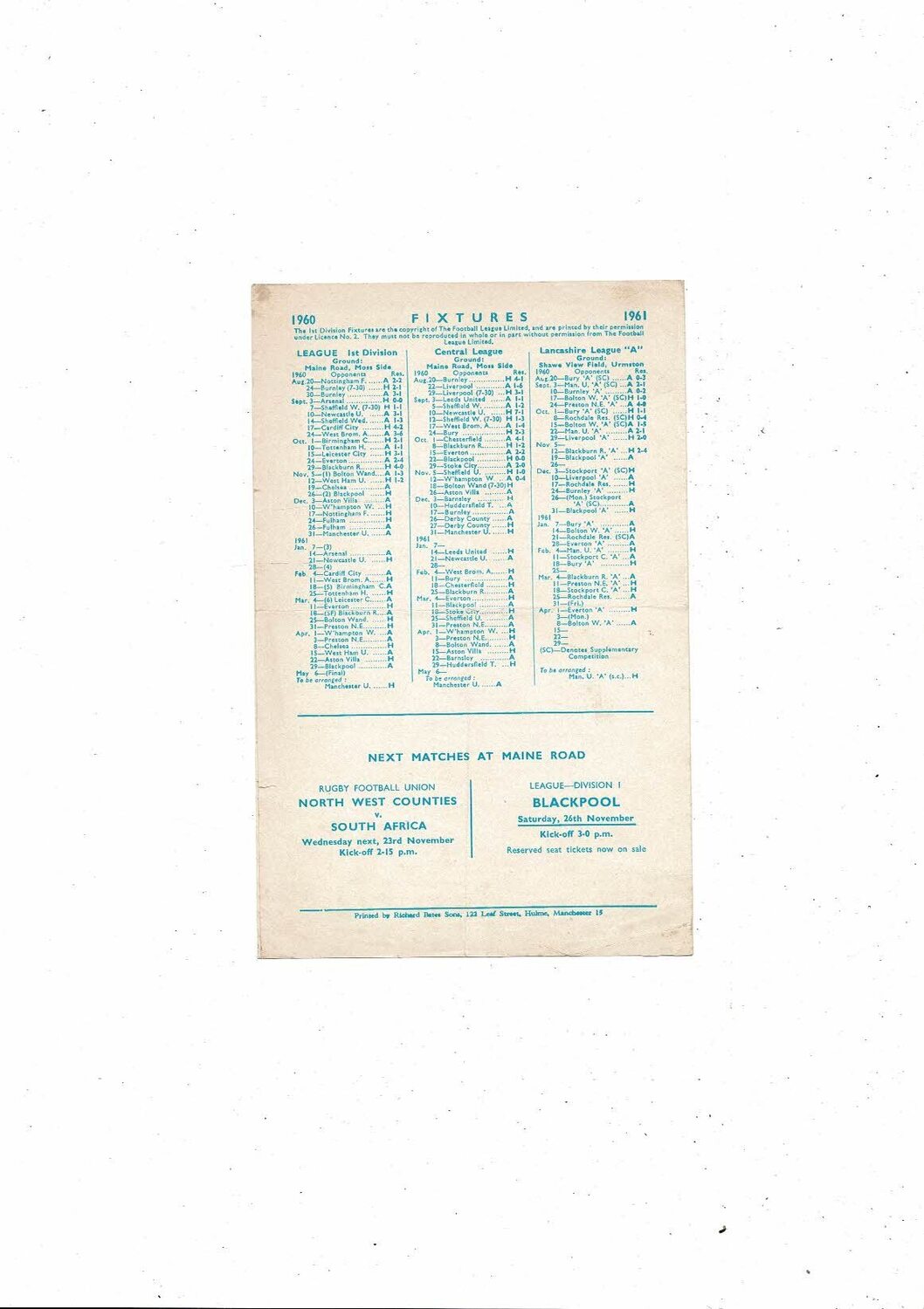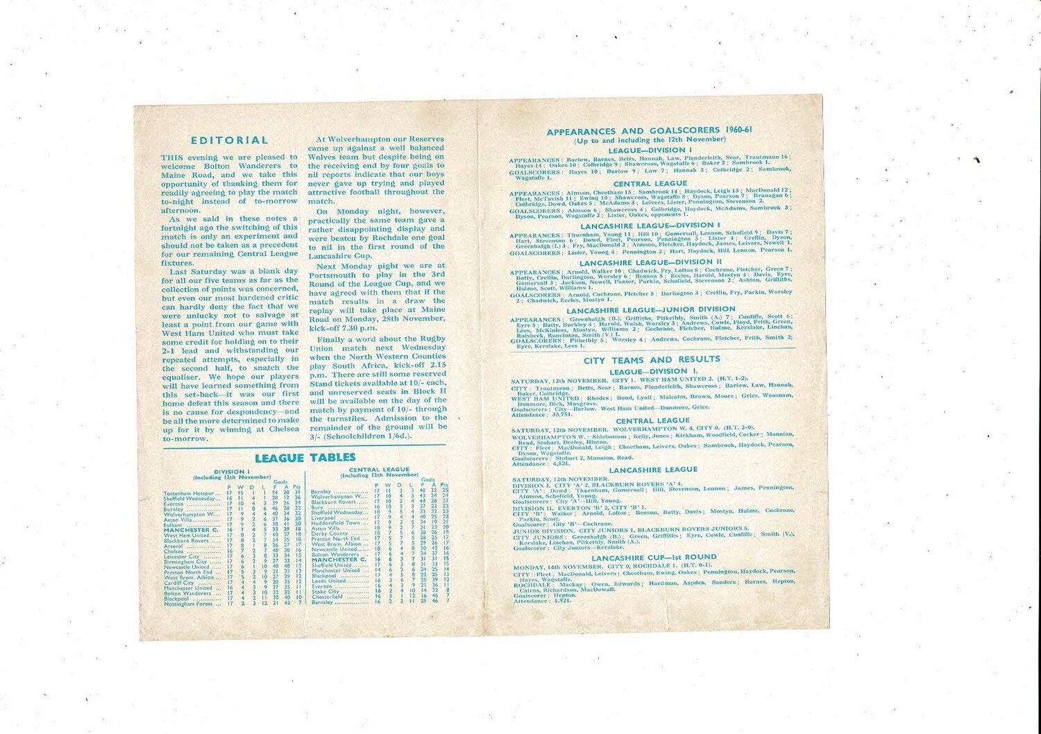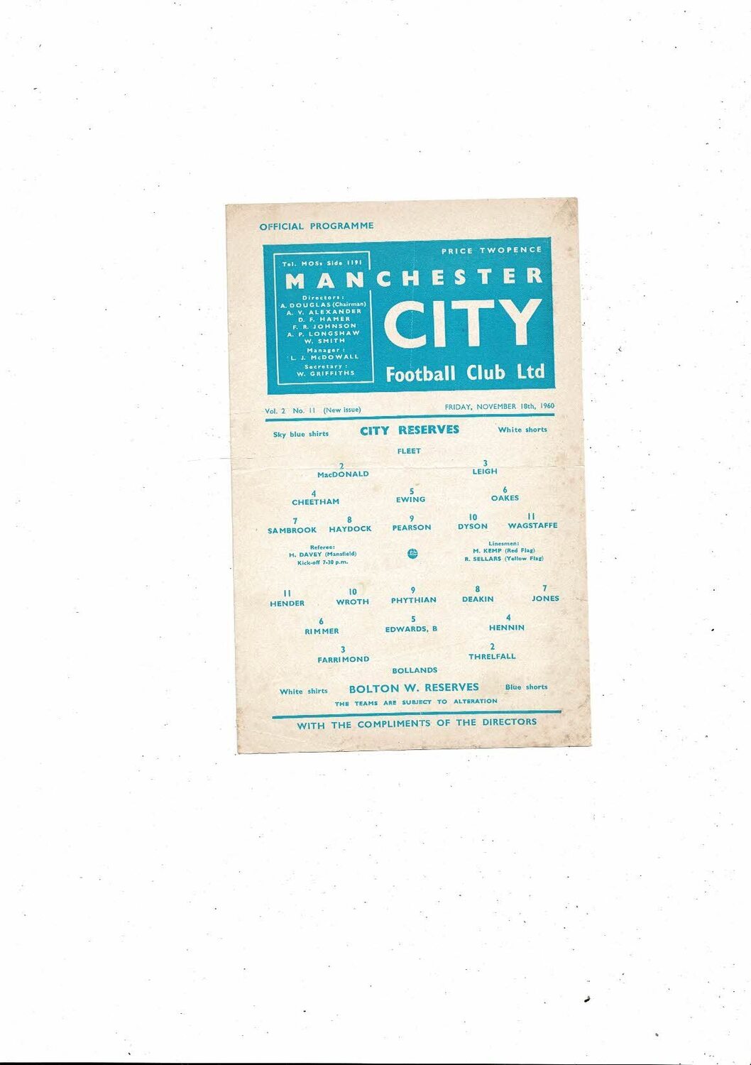 Manchester City v Bolton Wanderers Central League Football Programme 1960/61