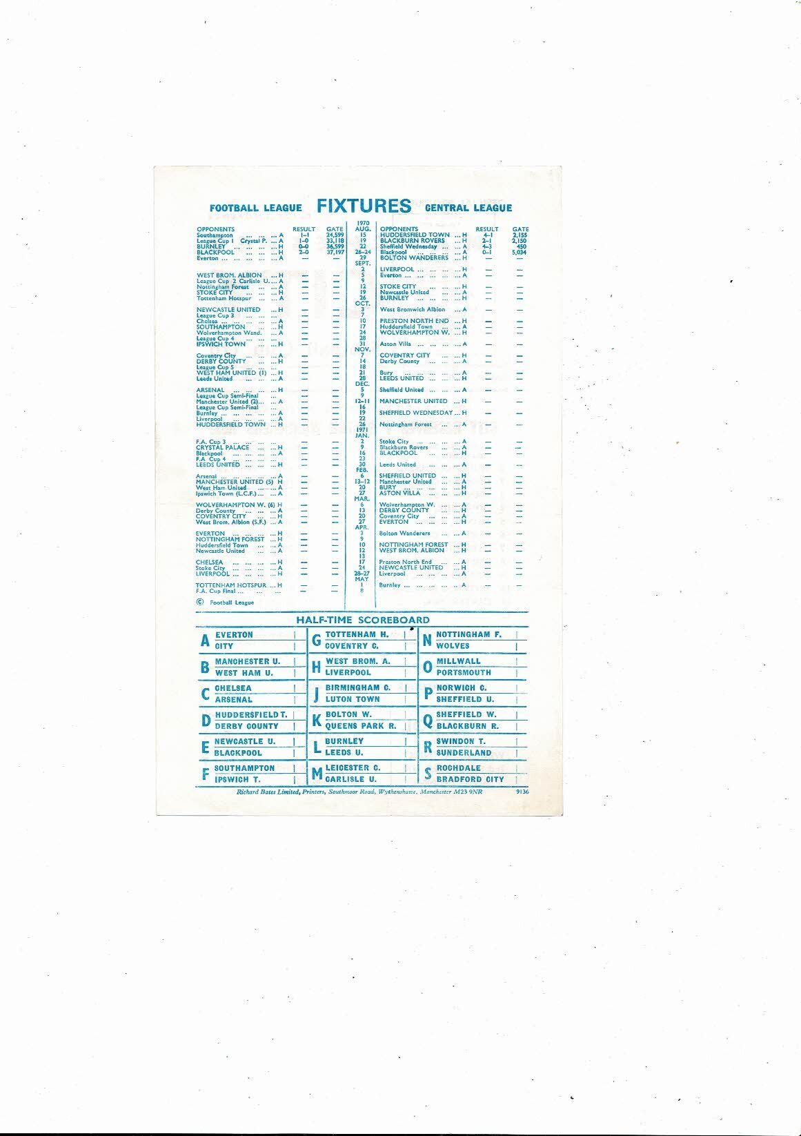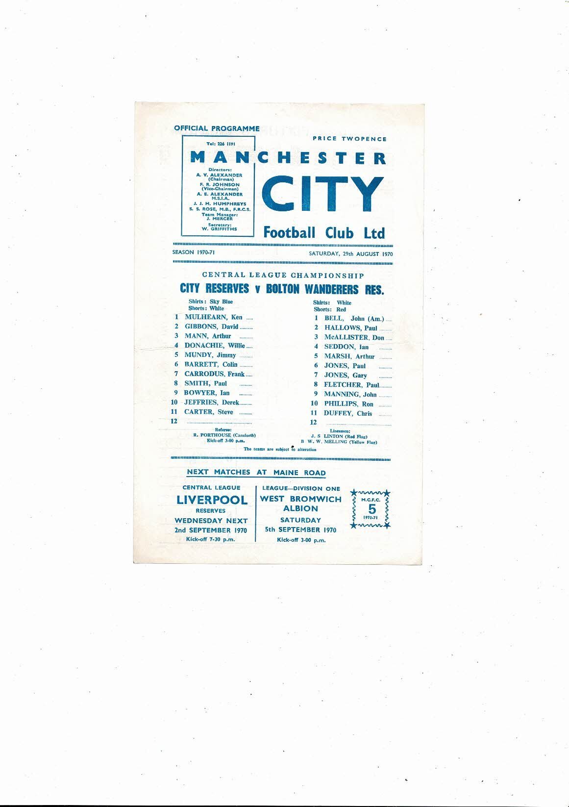 Manchester City v Bolton Wanderers Central League Football Programme 1970/71