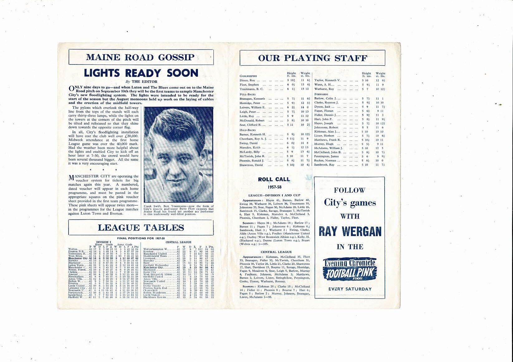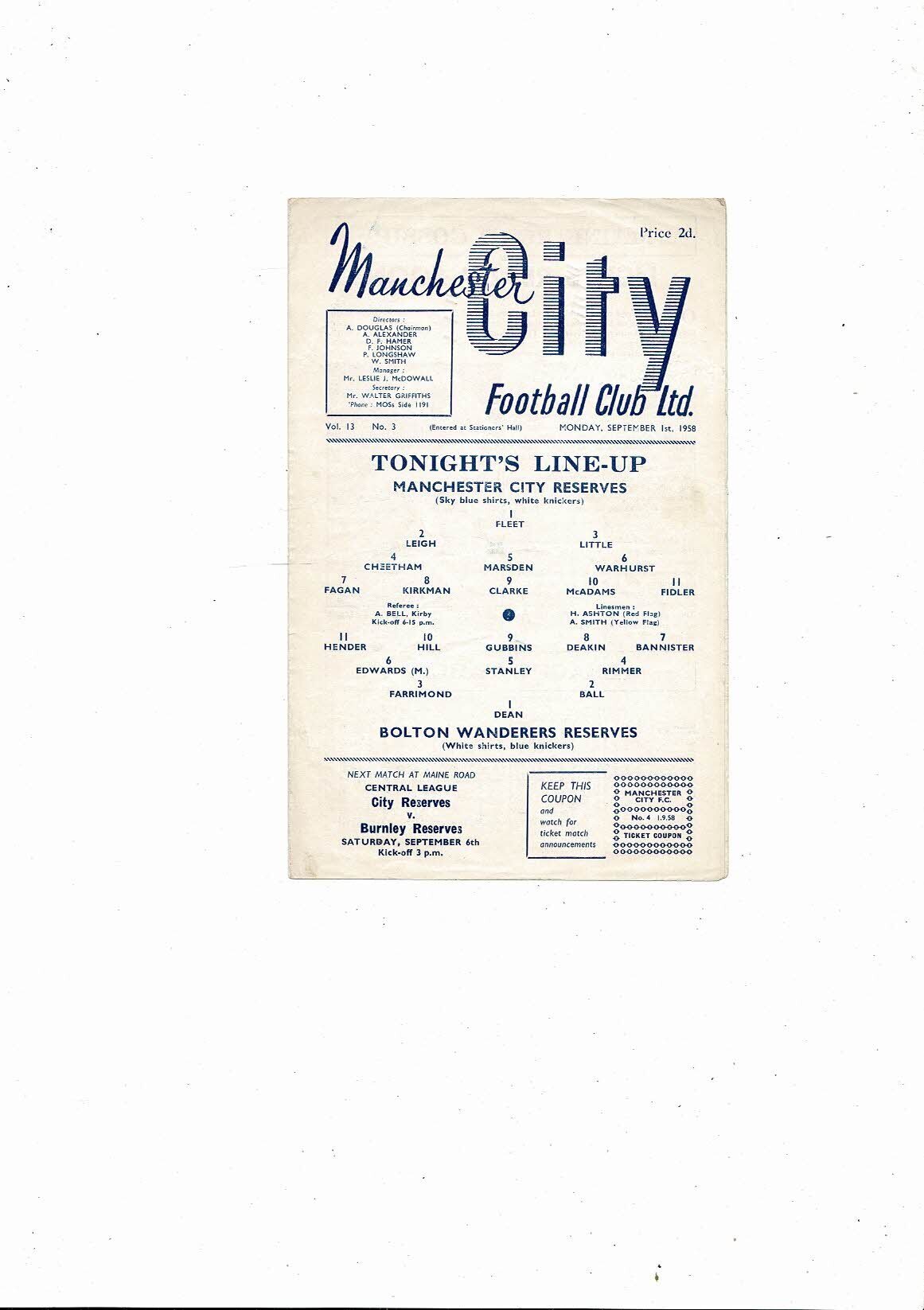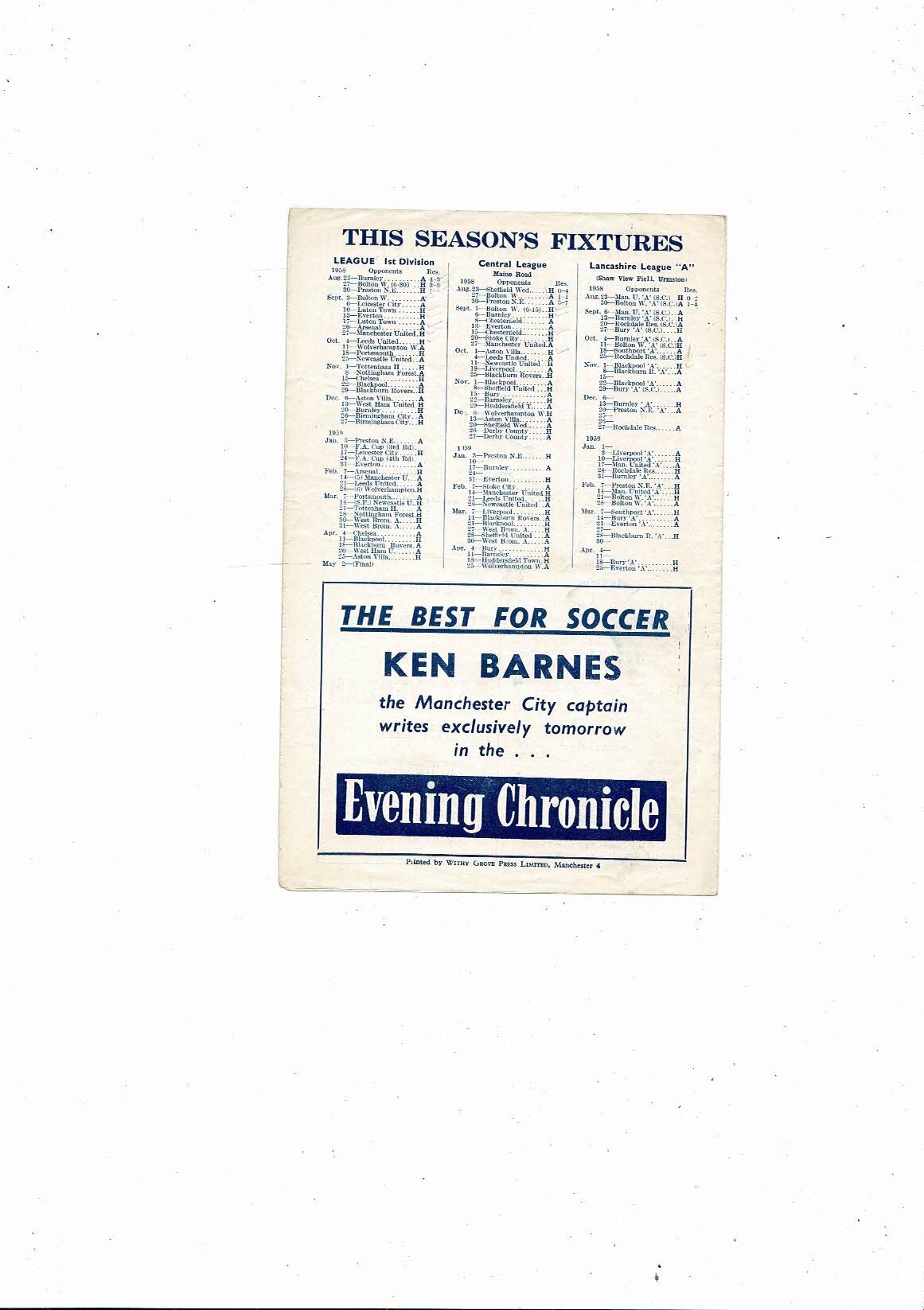 Manchester City v Bolton Wanderers Reserves Football Programme 1958/59