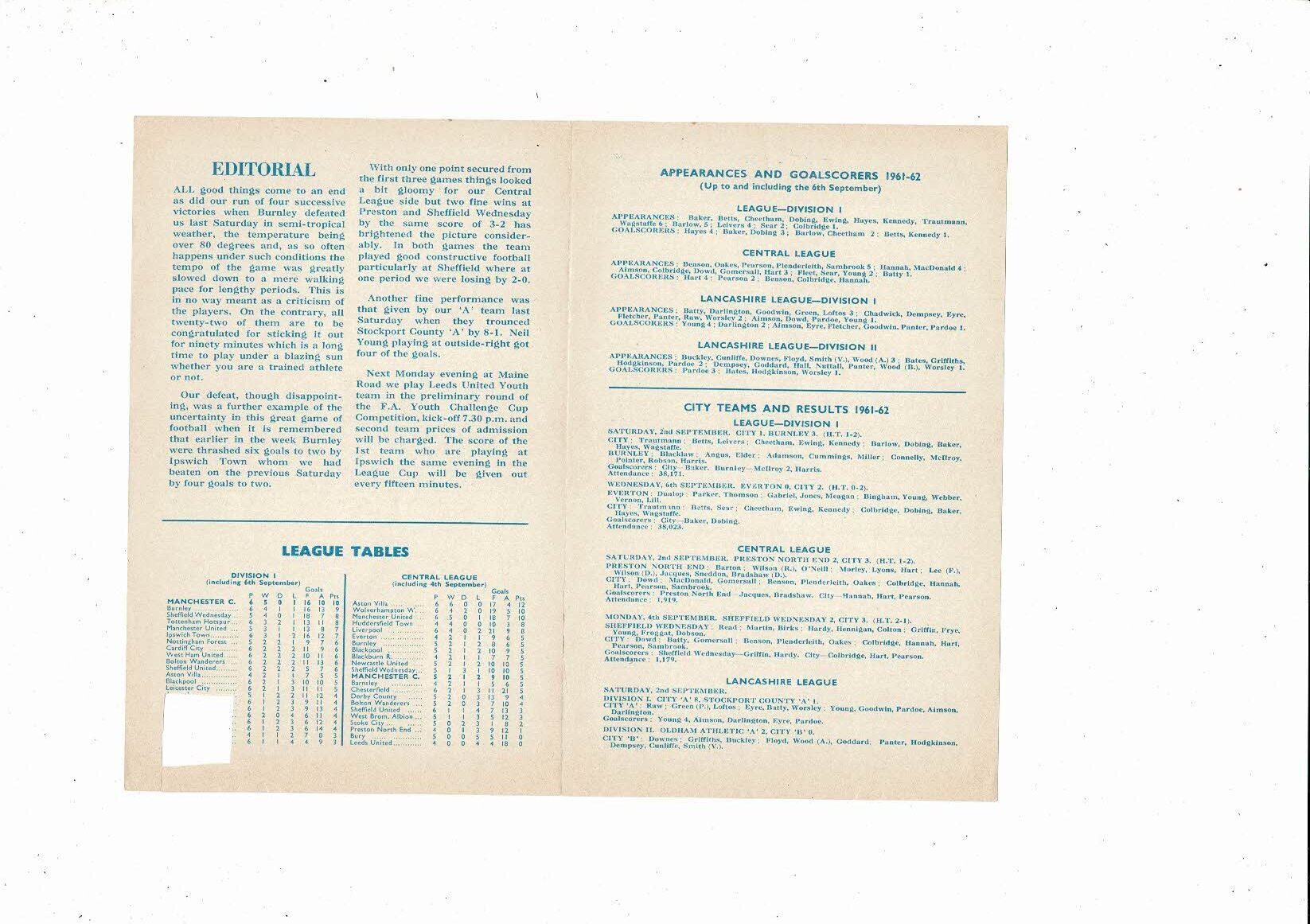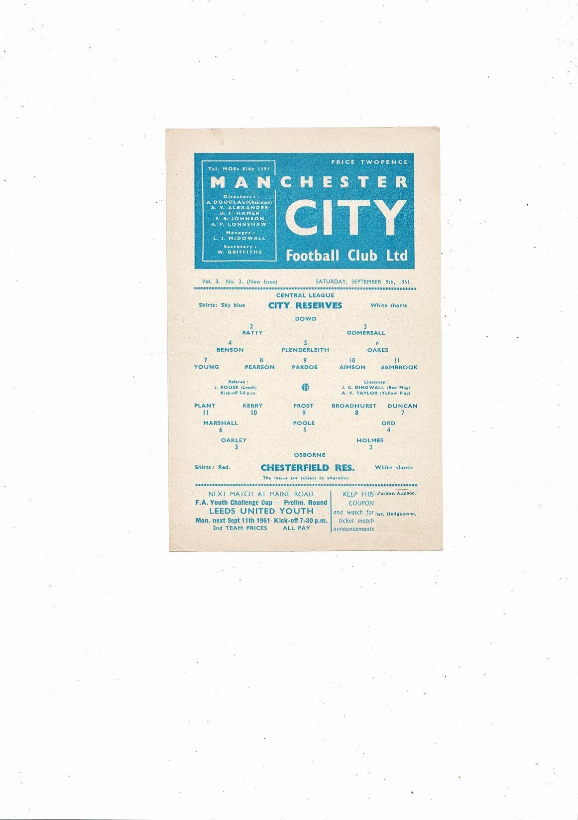 Manchester City v Chesterfield Central League Football Programme 1961/62