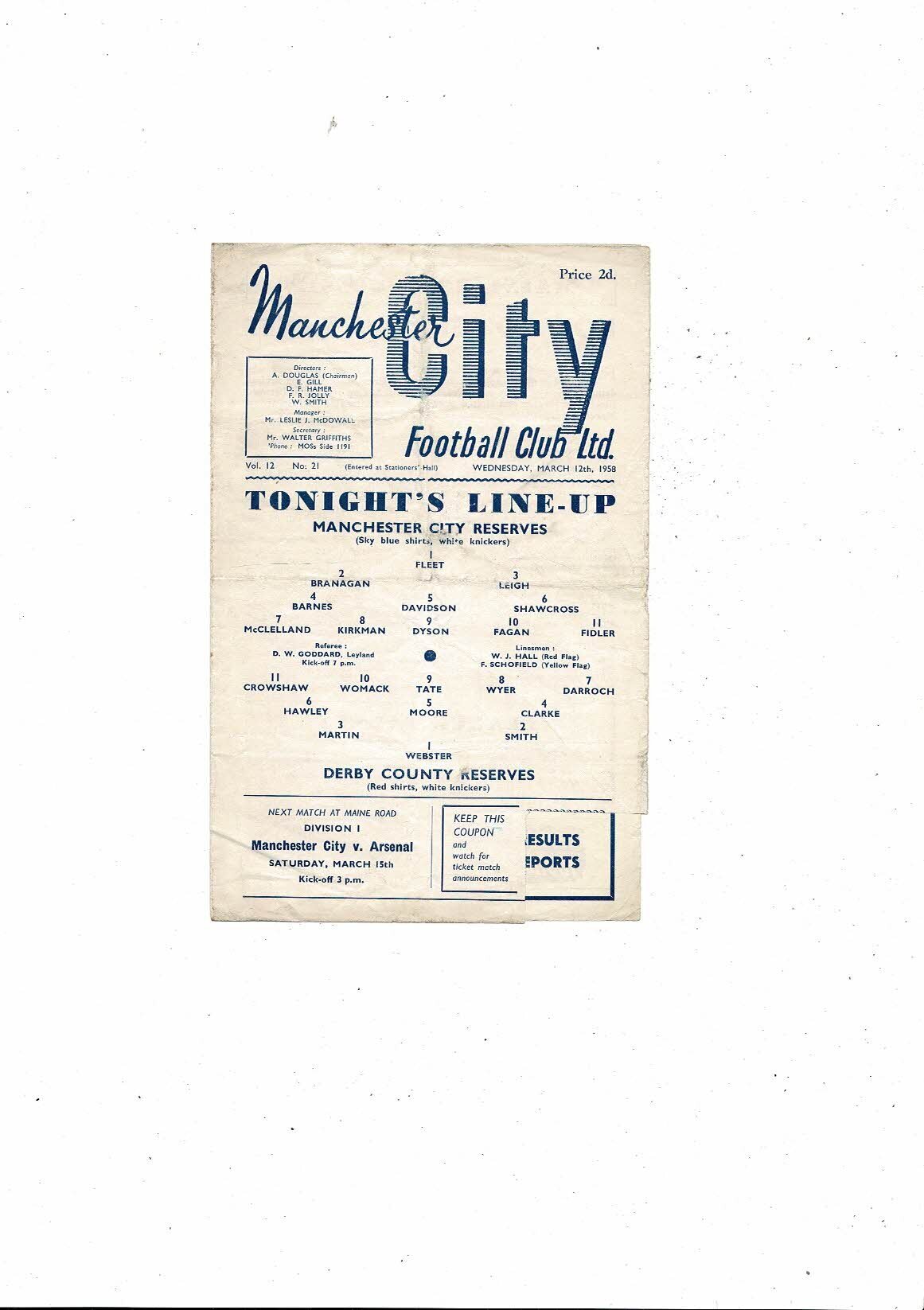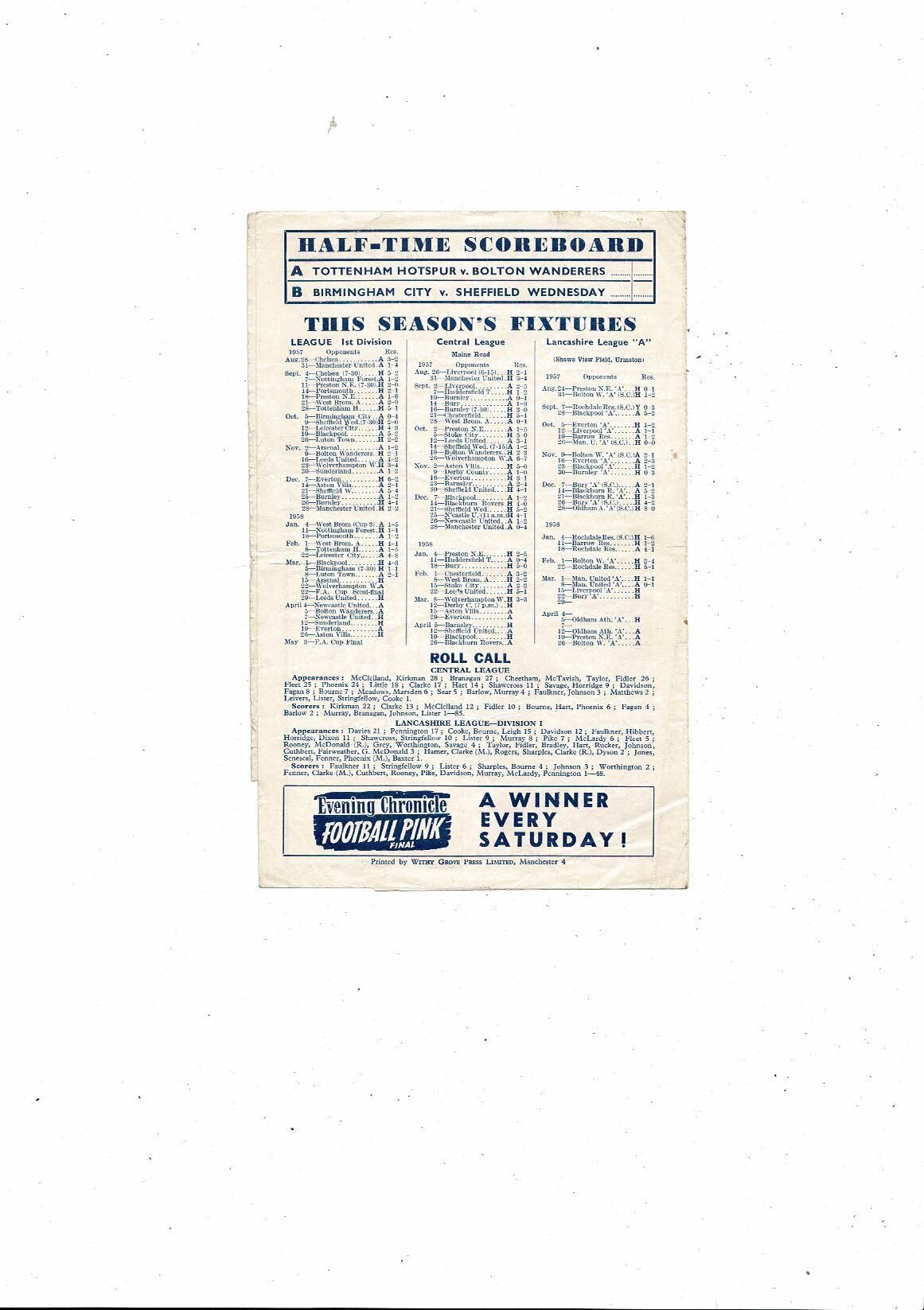 Manchester City v Derby County Central League Football Programme 1957/58