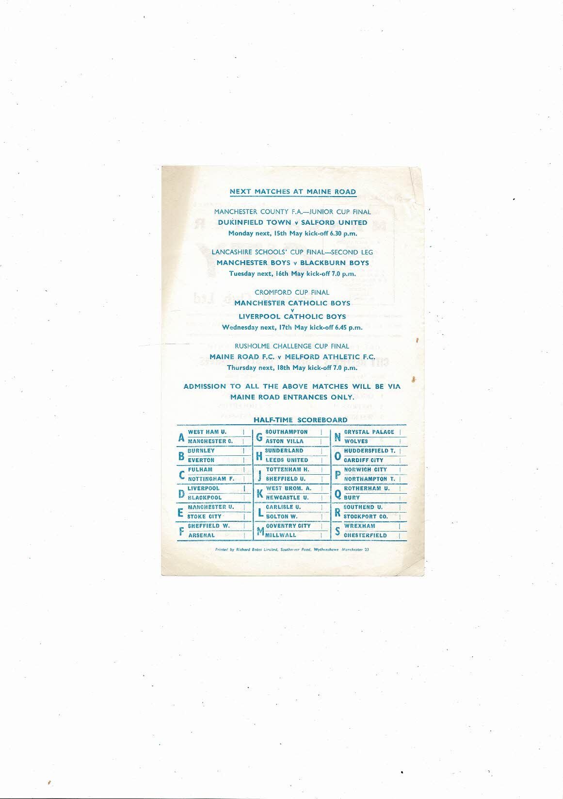 This Original Single Sheet Football Programme is creased also has a fold with some staining. No handwriting. Please see scans