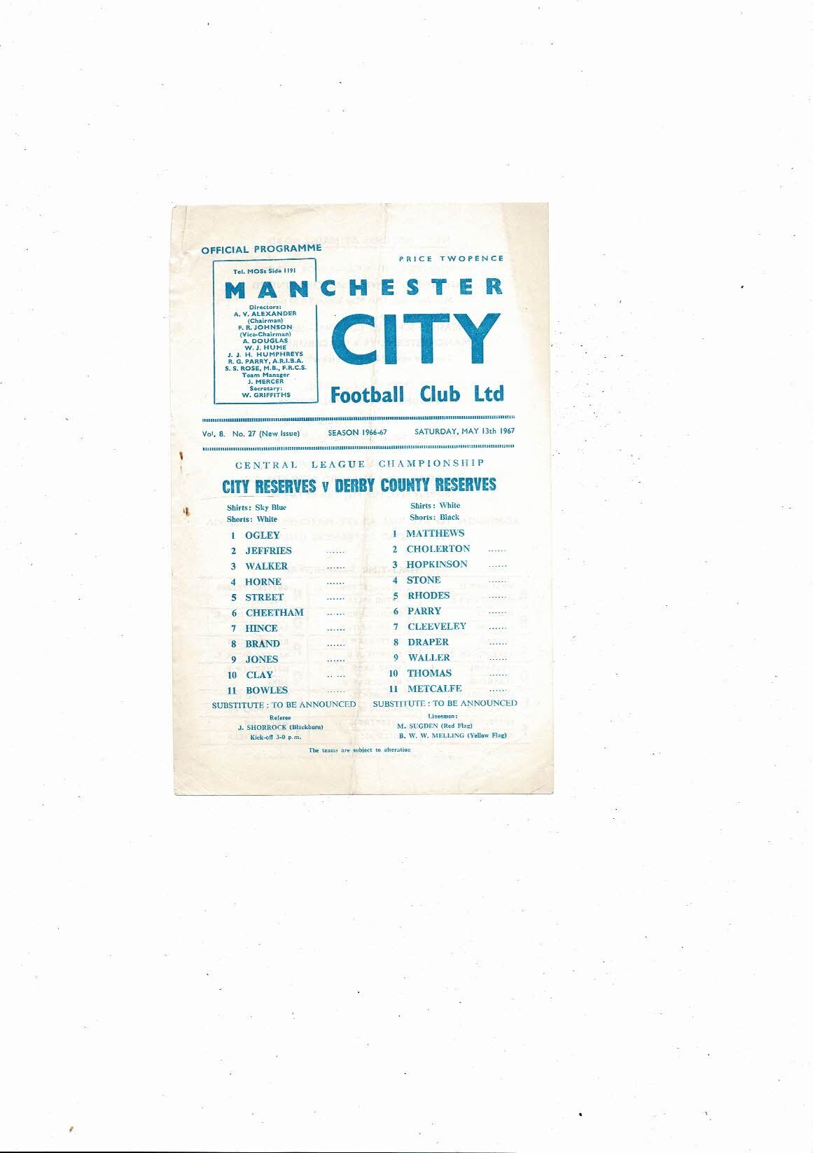 Manchester City v Derby County Central League Football Programme 1966/67