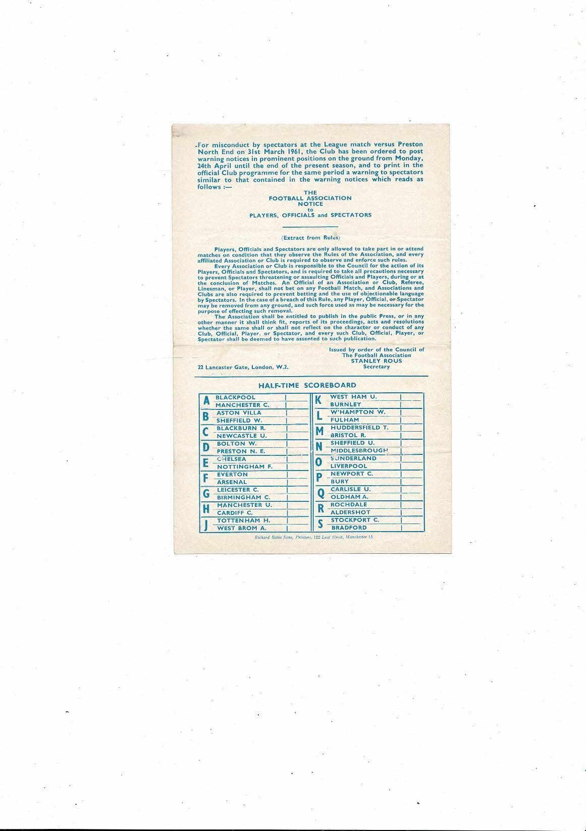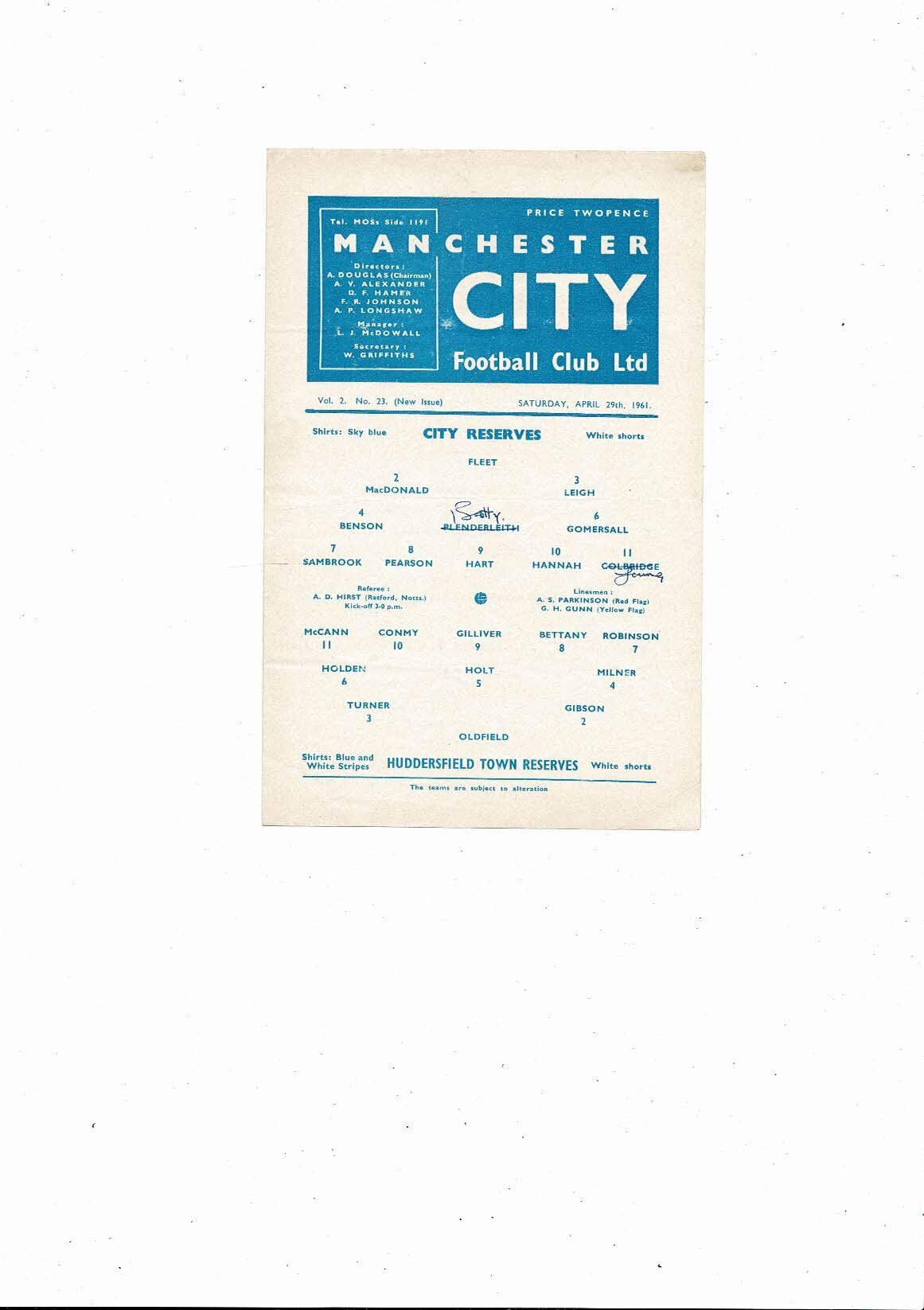 The Original 4 page Football Programme is creased & folded with some minor staining, tiny nic & two team changes. Please see scans