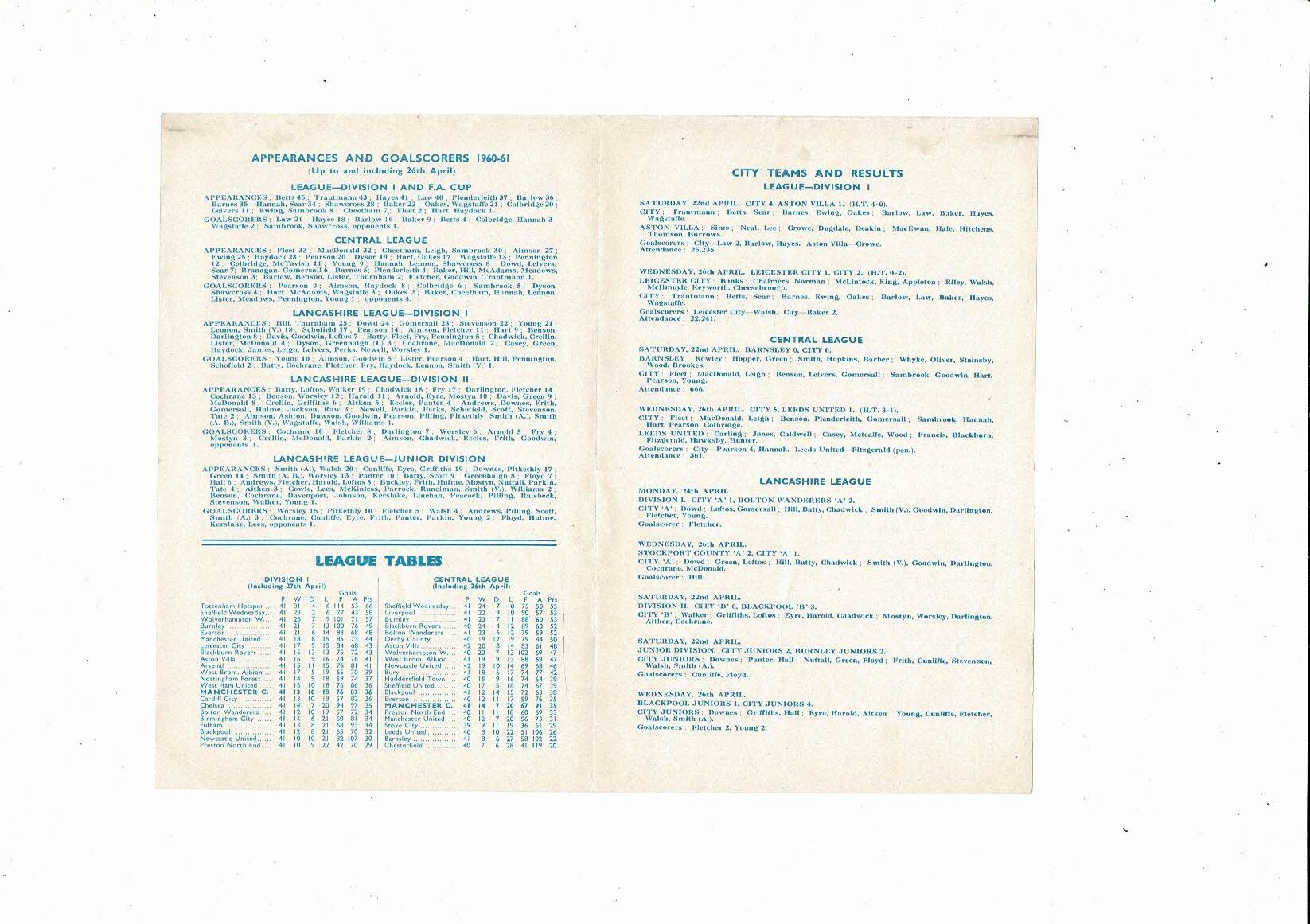 Manchester City v Huddersfield Town Central League Football Programme 1960/61