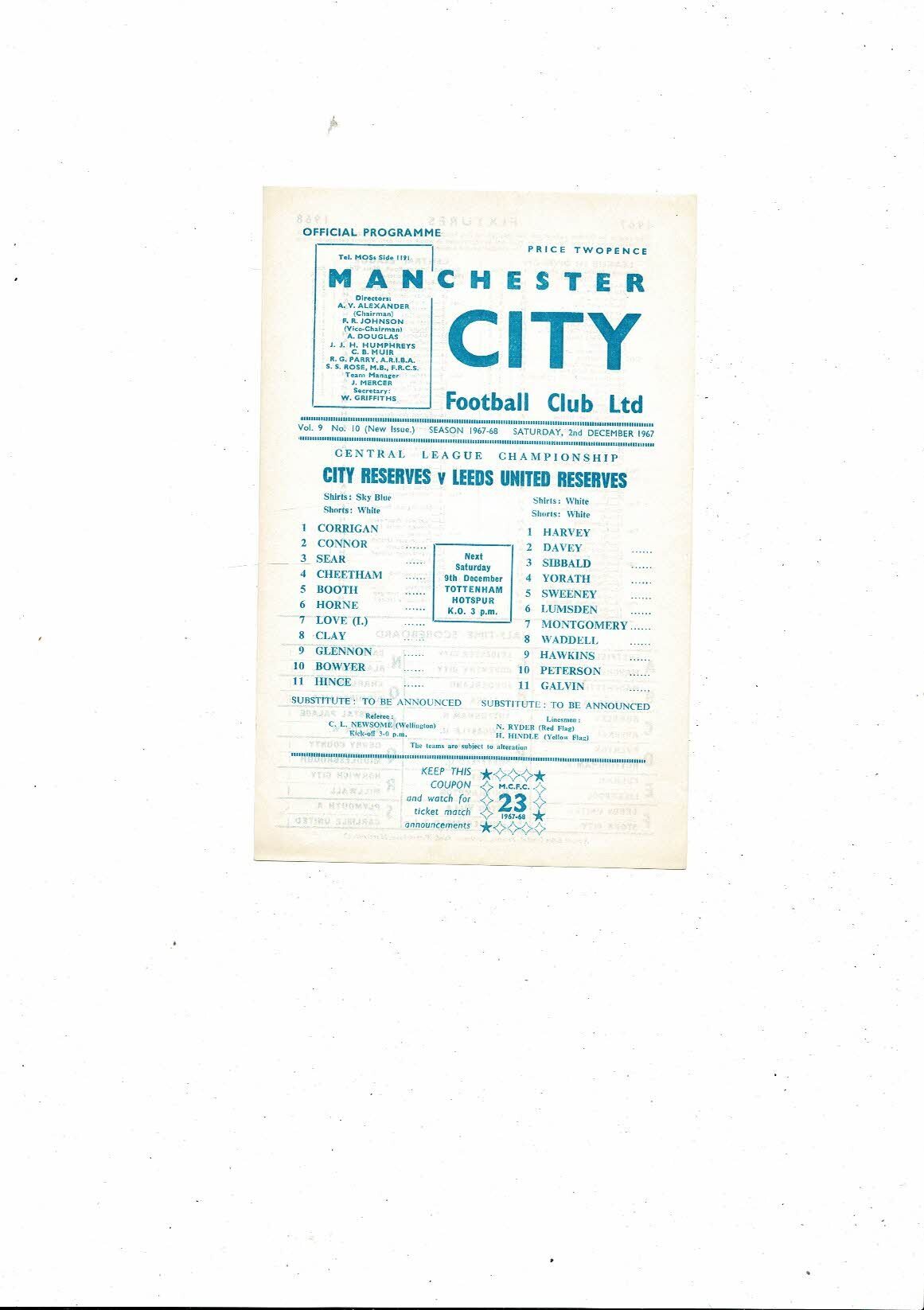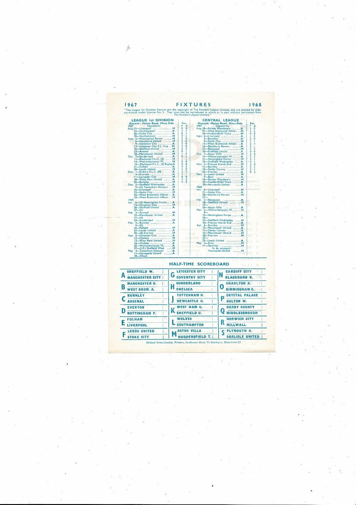 Manchester City v Leeds United Central League Football Programme 1967/68