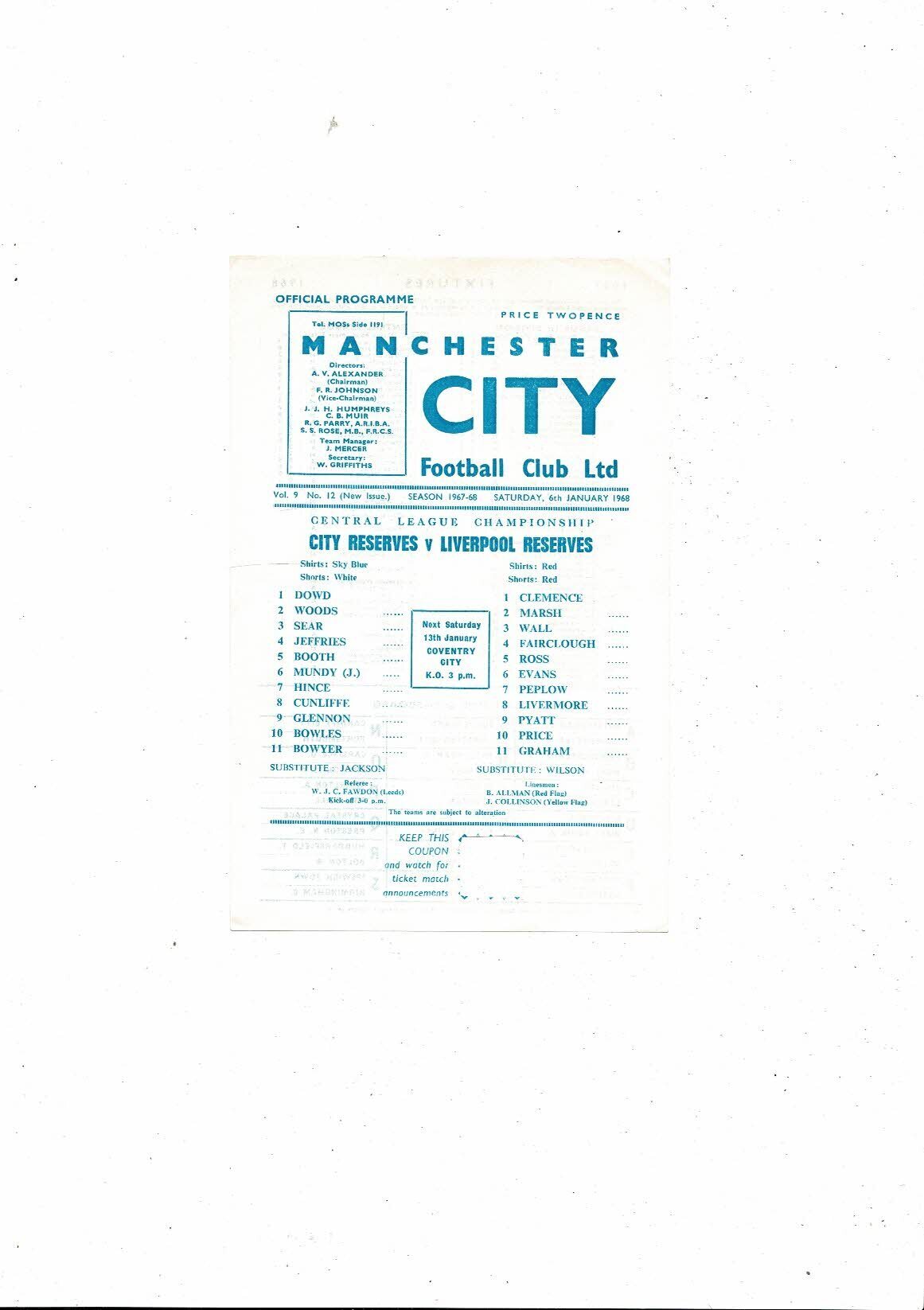 Manchester City v Liverpool Central League Football Programme 1967/68