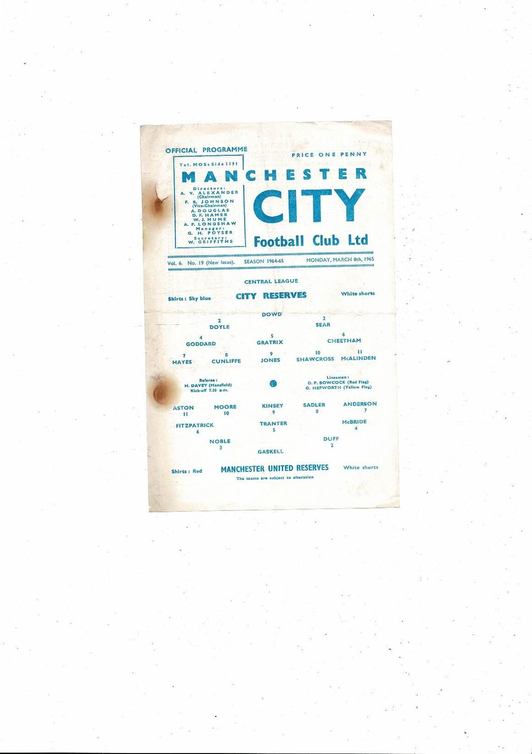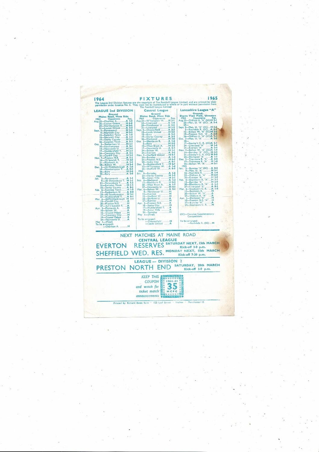 Manchester City v Manchester United Central League Football Programme 1964/65