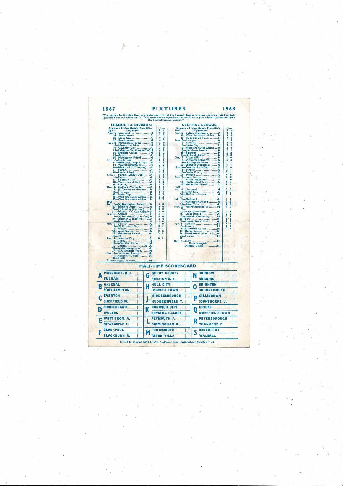 The Original Single Sheet Football Programme is creased & folded with some staining. No handwriting.
