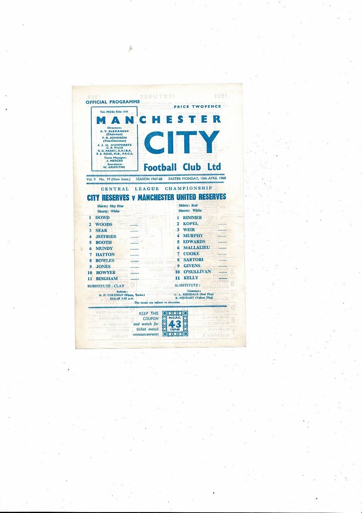 Manchester City v Manchester United Central League Football Programme 1967/68