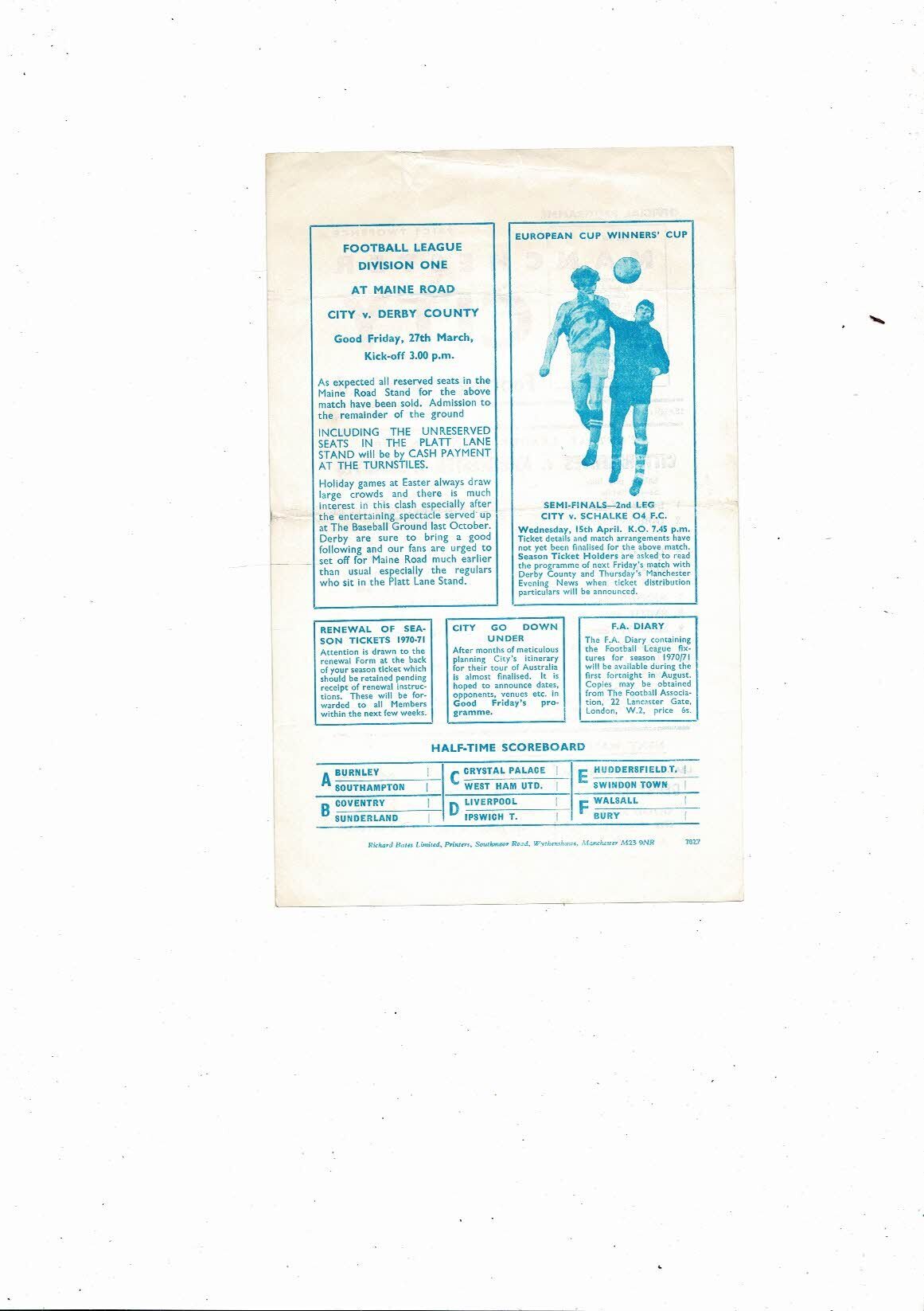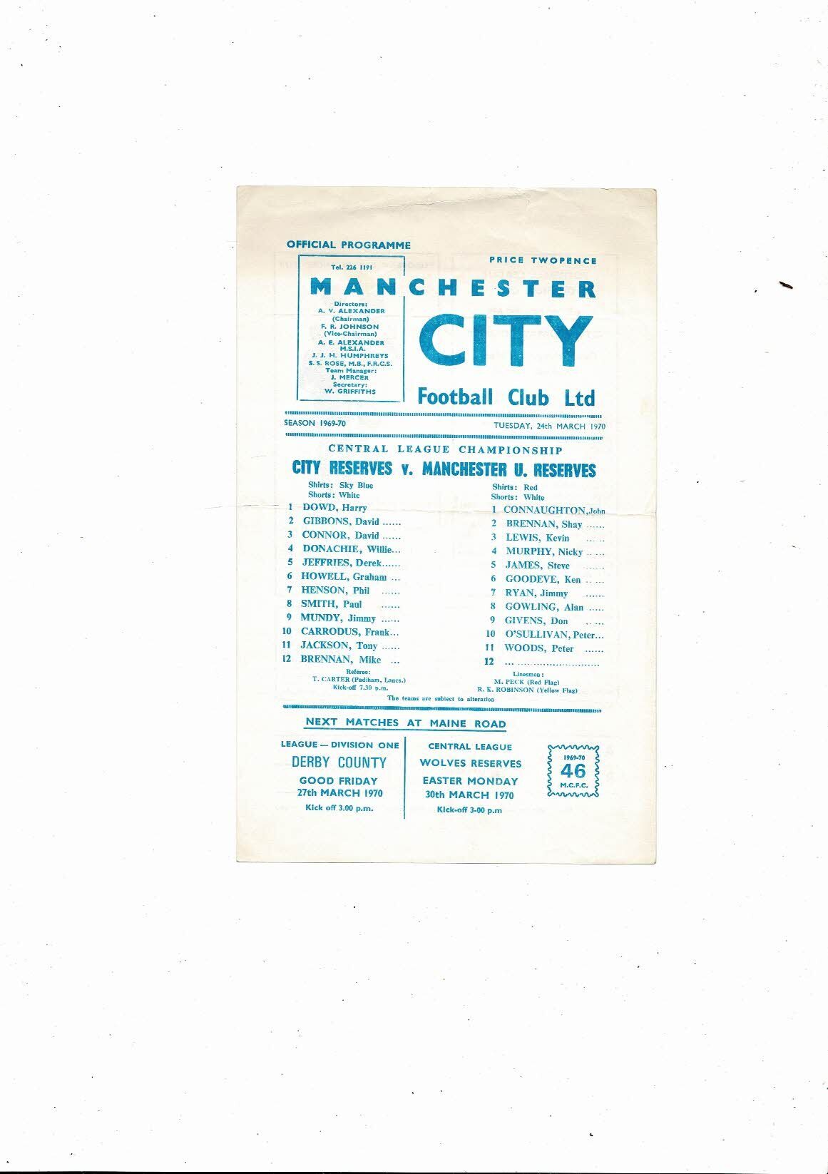 Manchester City v Manchester United Central League Football Programme 1969/70