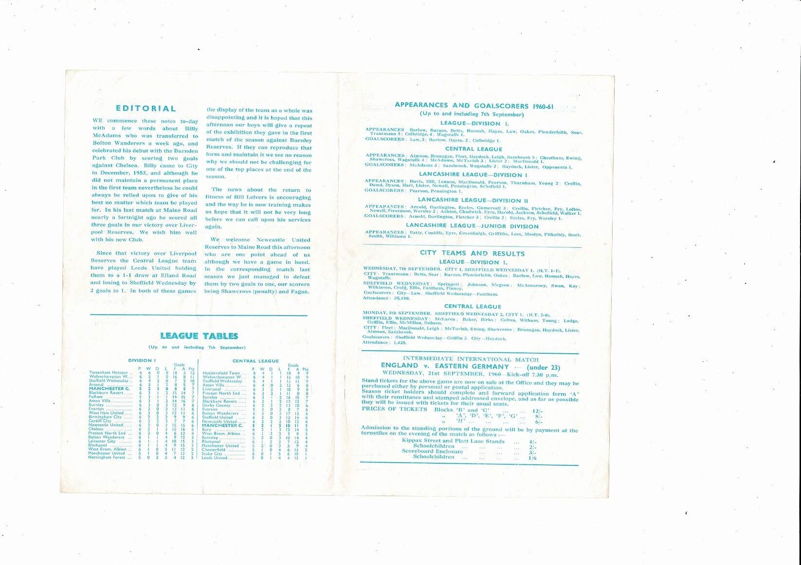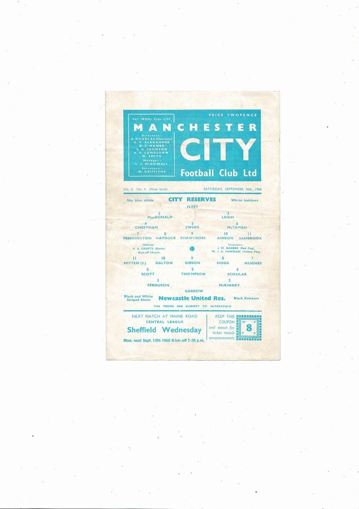Manchester City v Newcastle United Central League Football Programme 1960/61