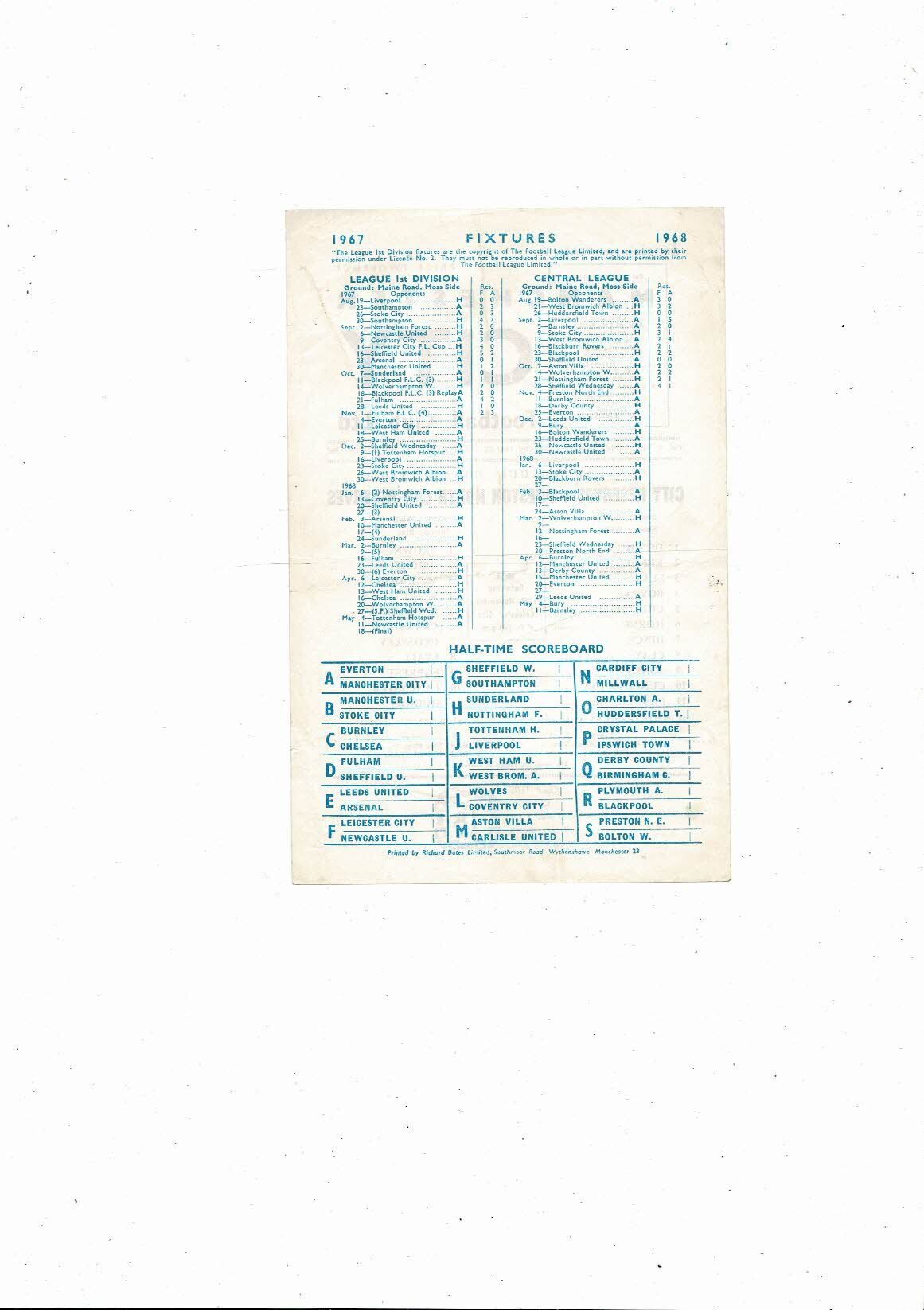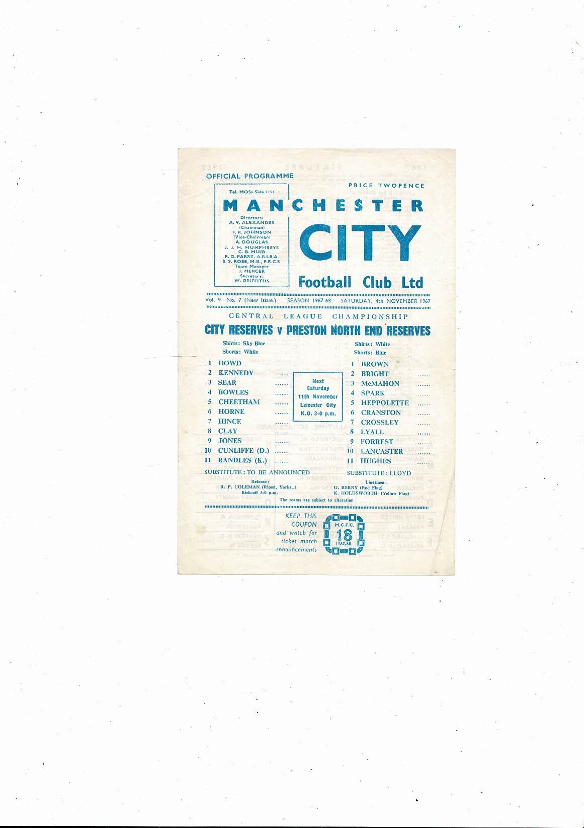 Manchester City v Preston North End Central League Football Programme 1967/68