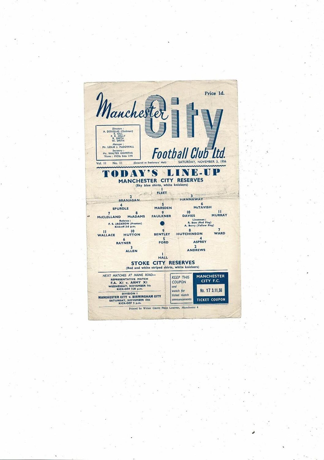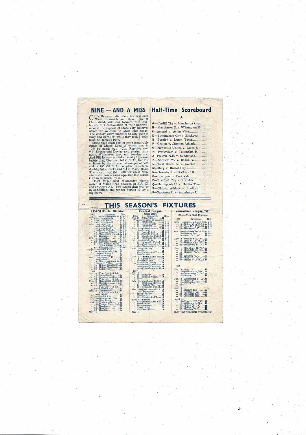 Manchester City v Stoke City Central League Football Programme 1956/57
