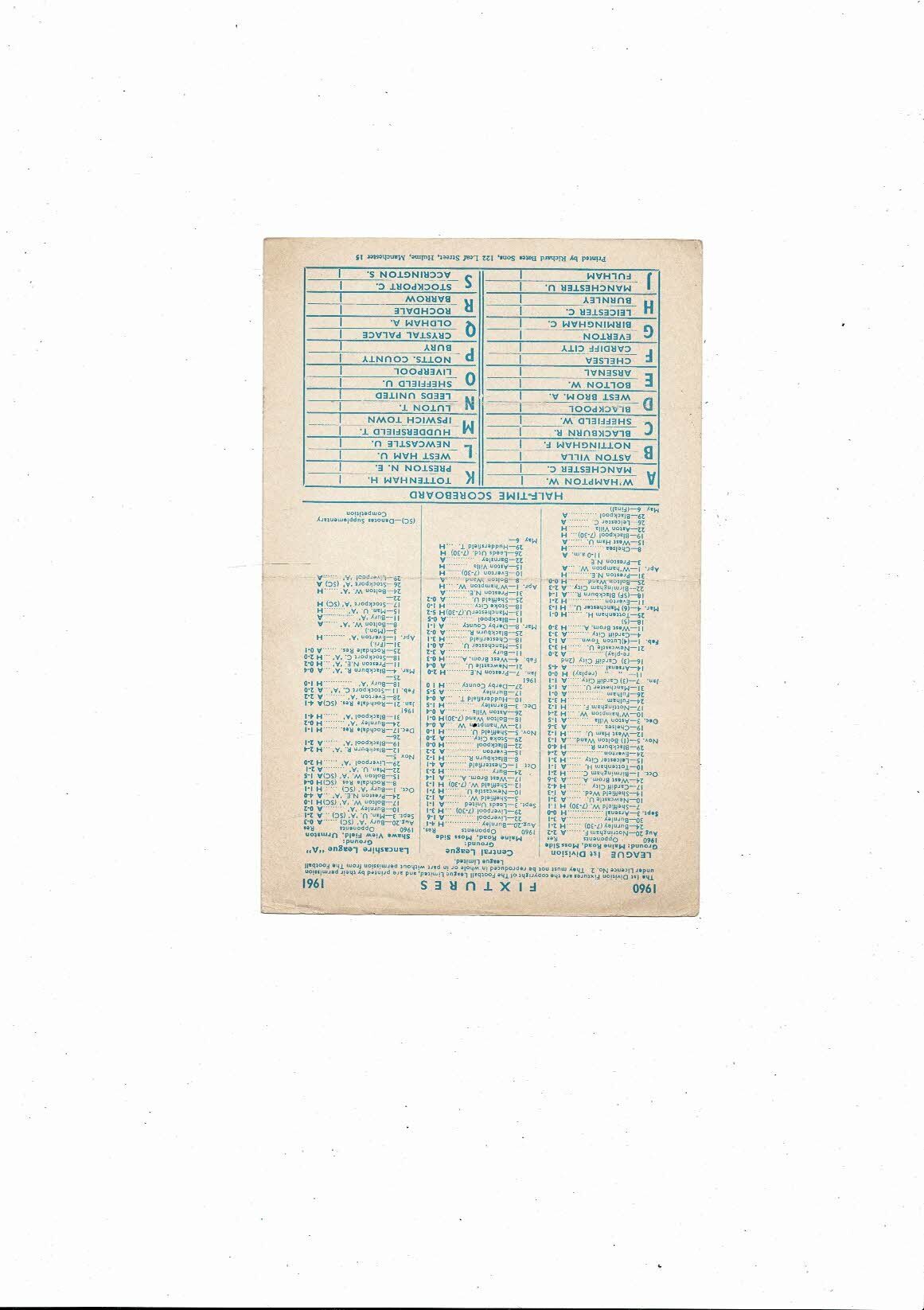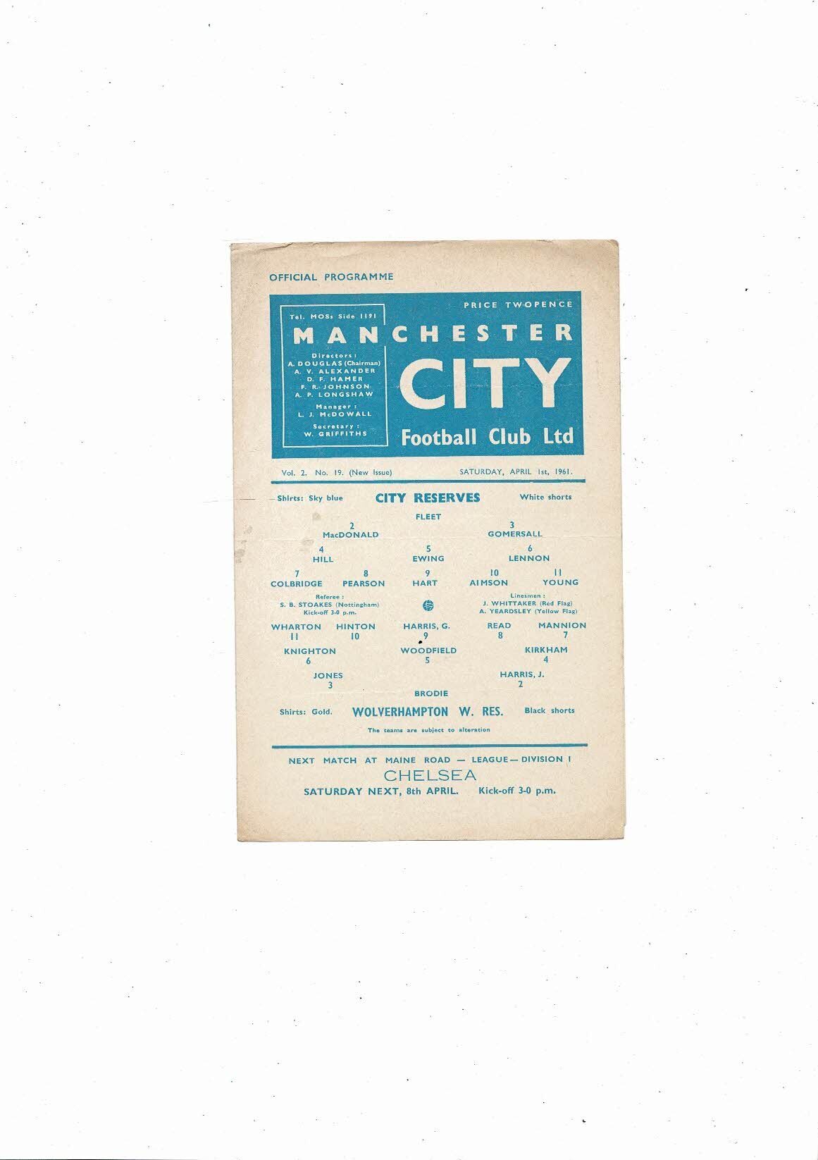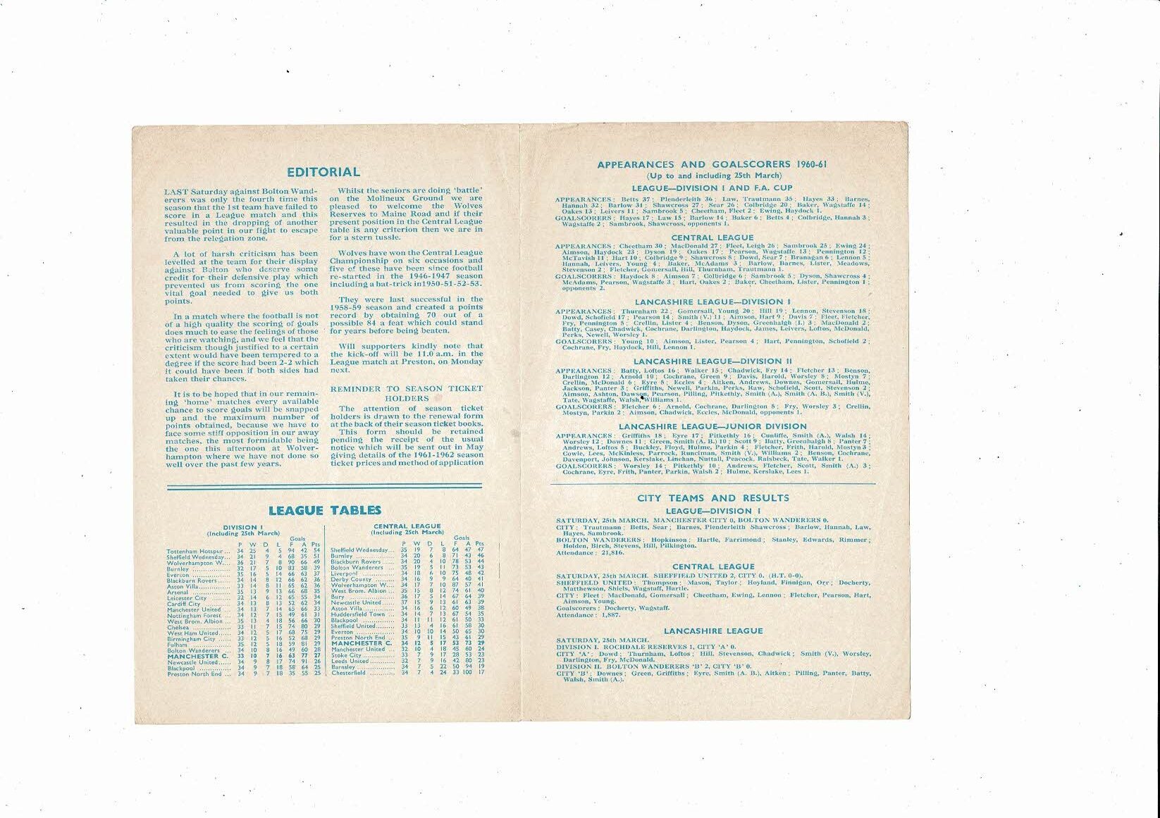 Manchester City v Wolves Central League Football Programme 1960/61