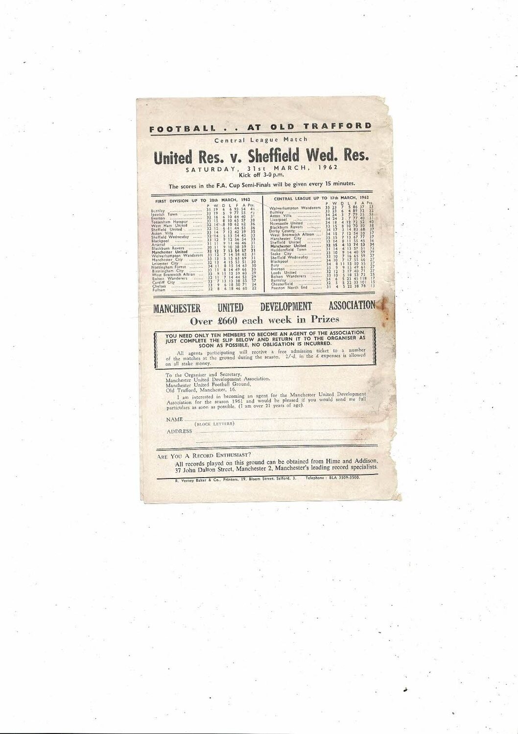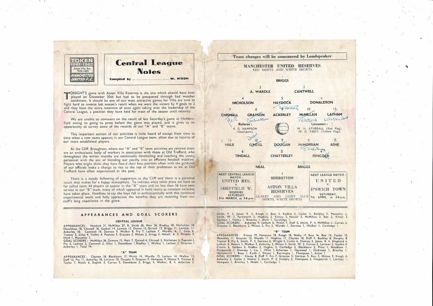 Manchester United v Aston Villa Central League Football Programme 1961/62