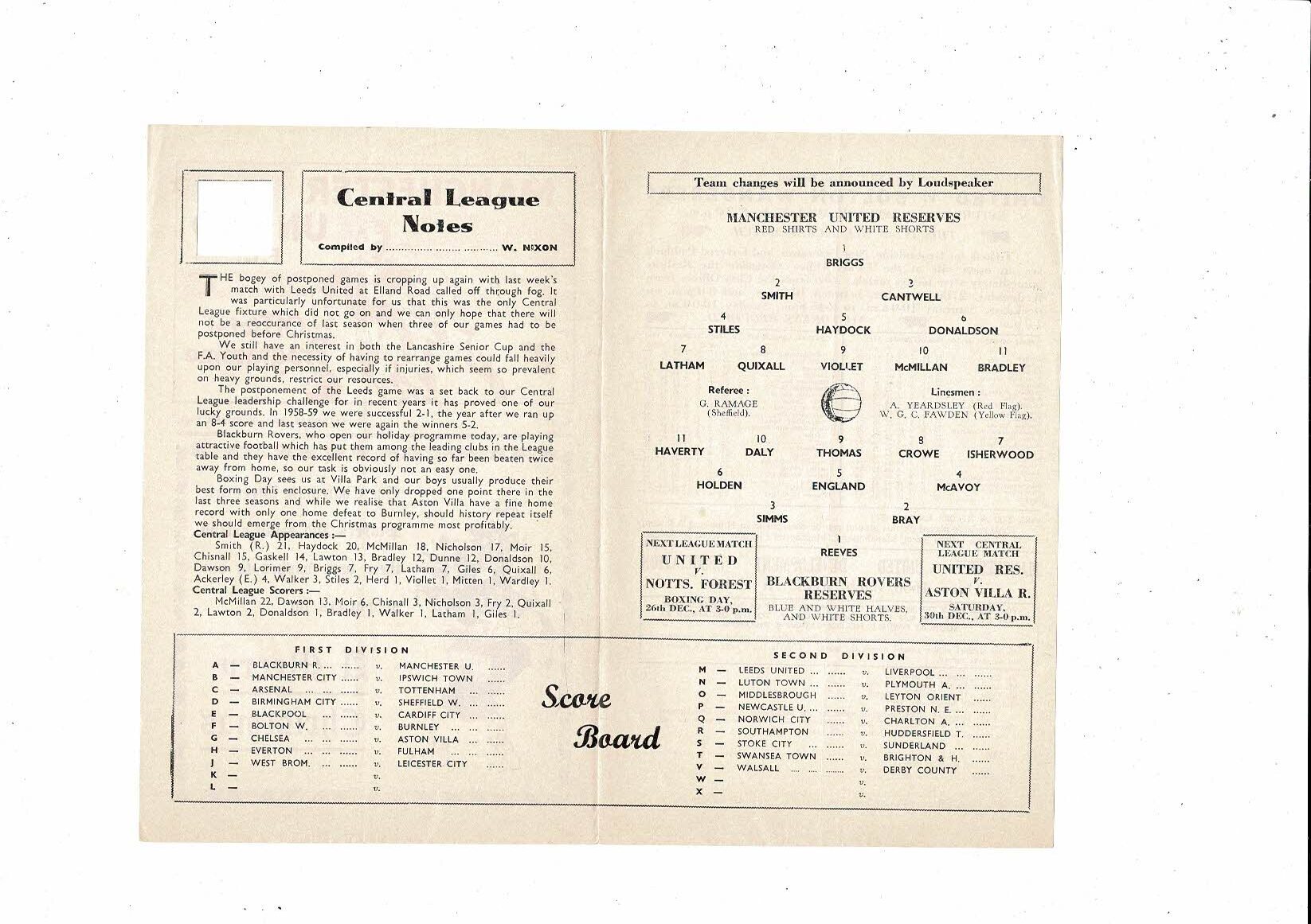 Manchester United v Blackburn Rovers Central League Football Programme 1961/62