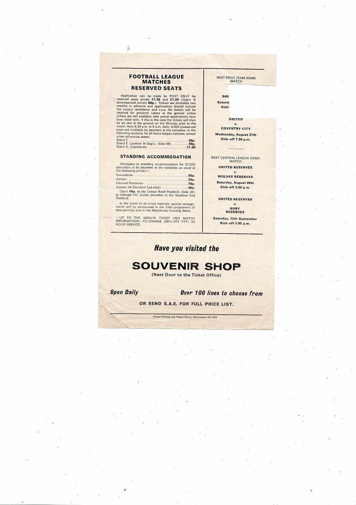 Manchester United v Coventry City Central League Football Programme 1975/76