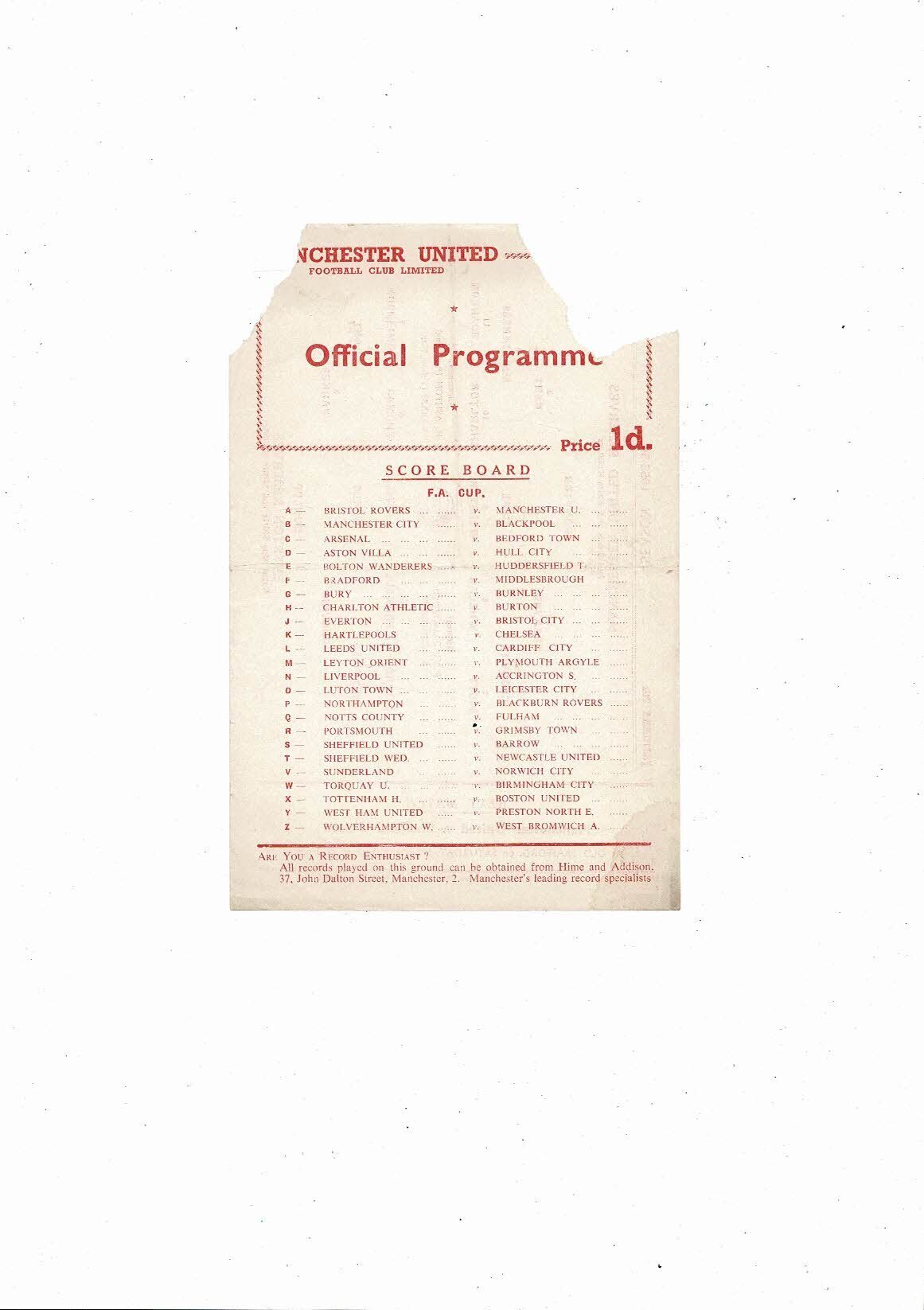 This Original Single Sheet Football Programme is creased with some staining, tiny nic, small tear on one of the folds & two large corner pieces missing. No handwriting. Please see scans.