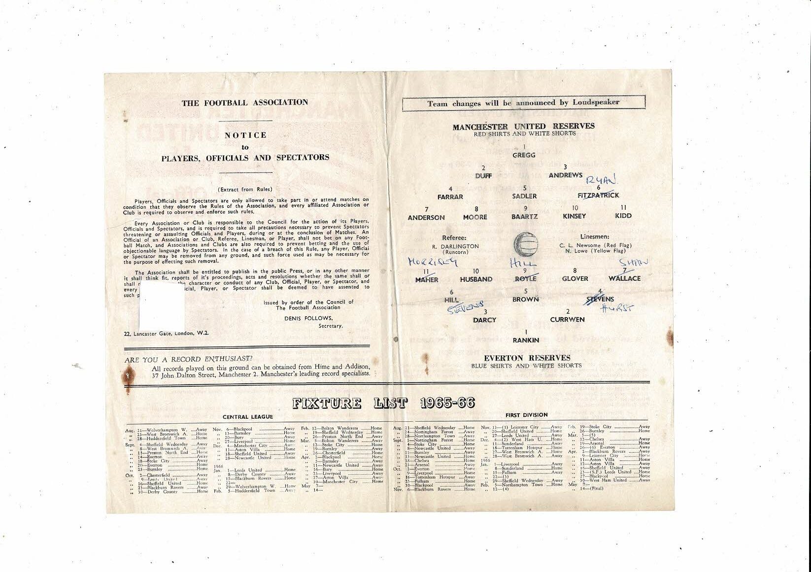 Manchester United v Everton Central League Football Programme 1965/66