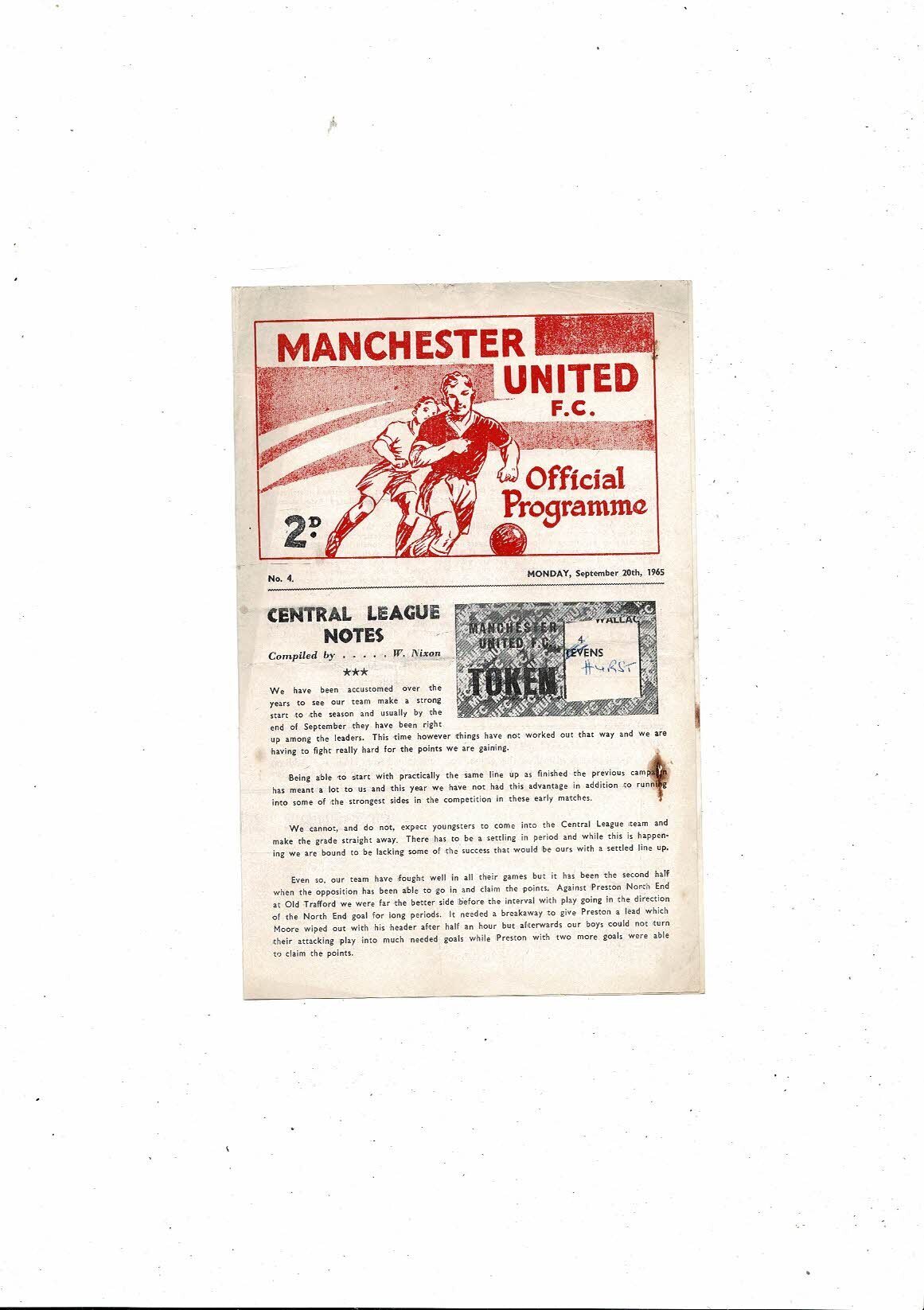 This Original 4 page Football Programme is creased & folded with some staining, team changes, a couple of small tears on top edge & token neatly removed. Please see scans.
