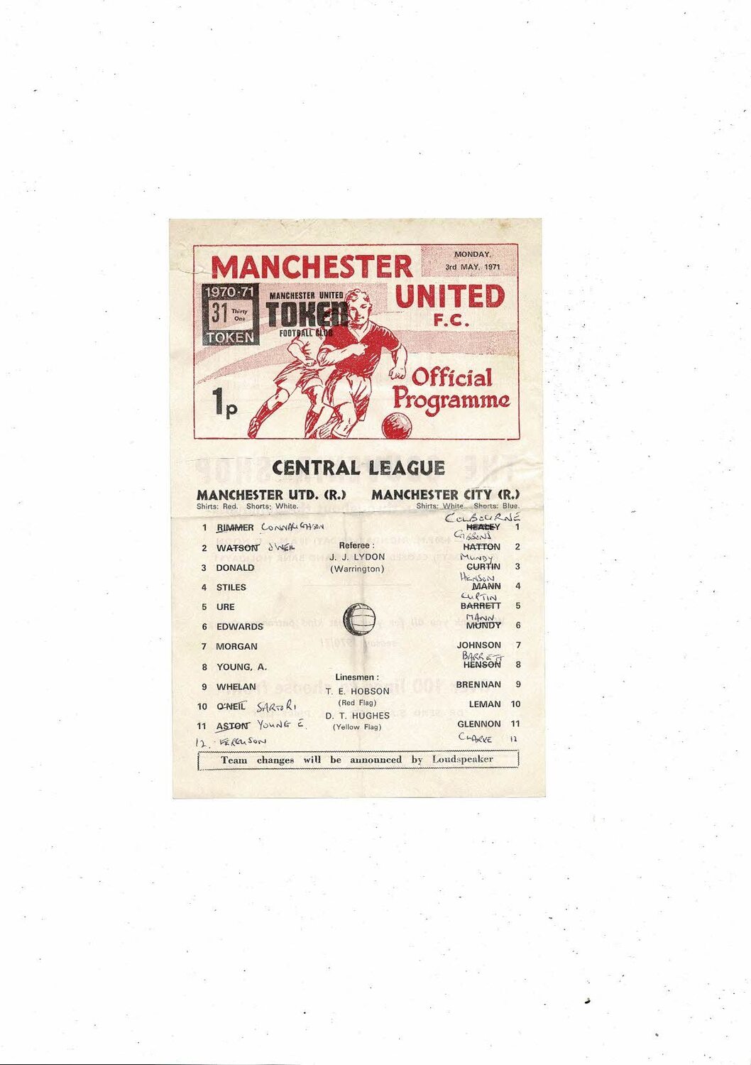 This original single sheet Football Programme is creased & folded with some staining, team changes, tear on edge & several tiny nic's. Also has the Token. Please see scans.