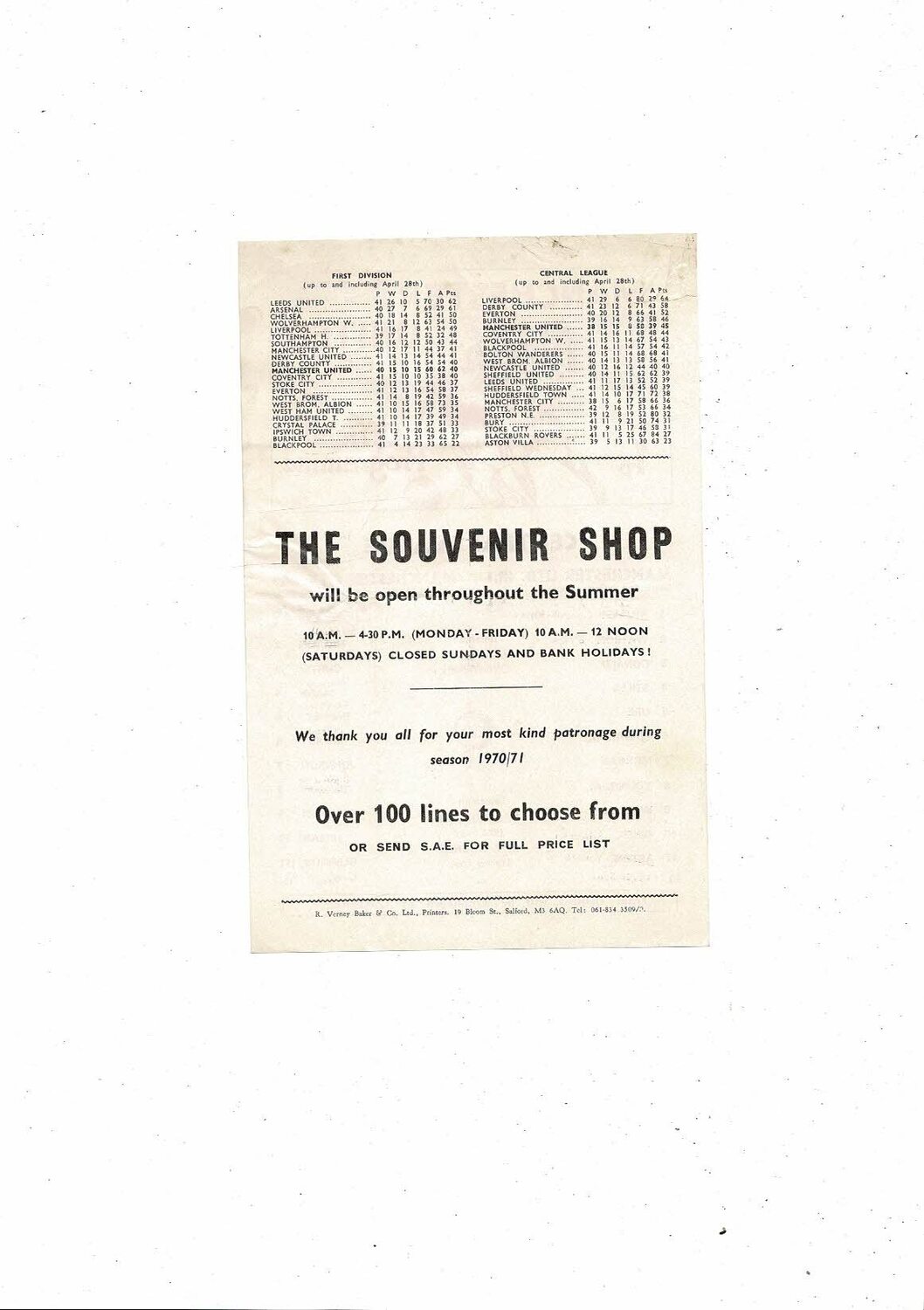Manchester United v Manchester City Central League Football Programme 1970/71