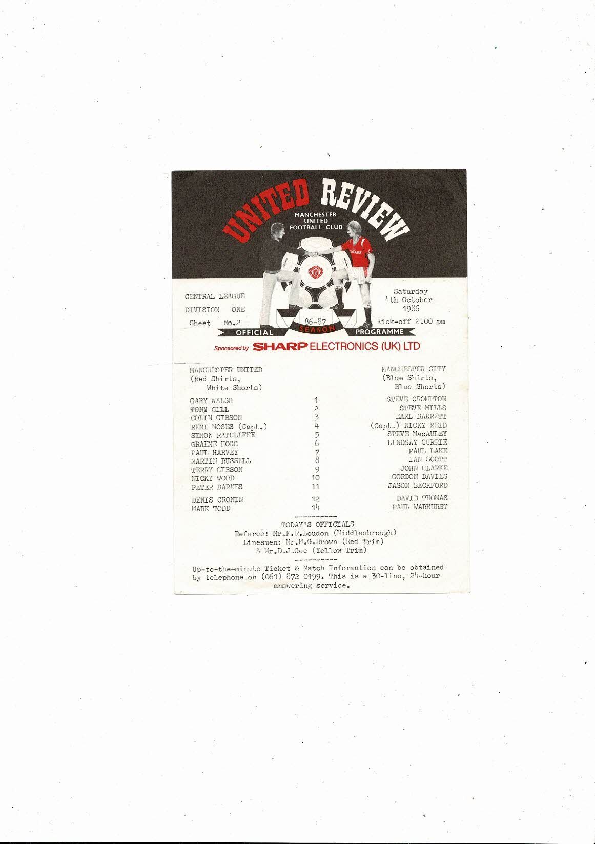 Manchester United v Manchester City Central League Football Programme 1986/87