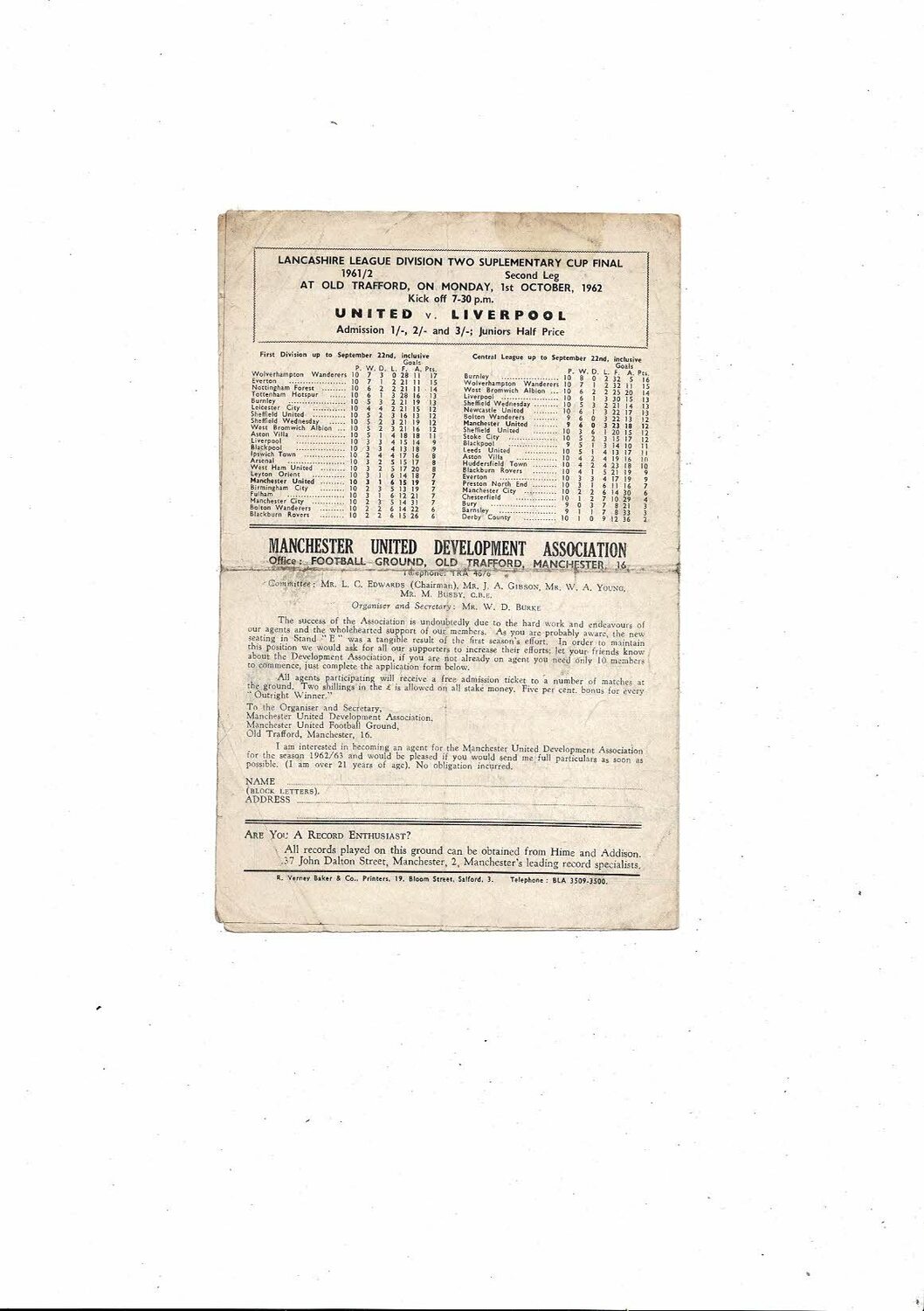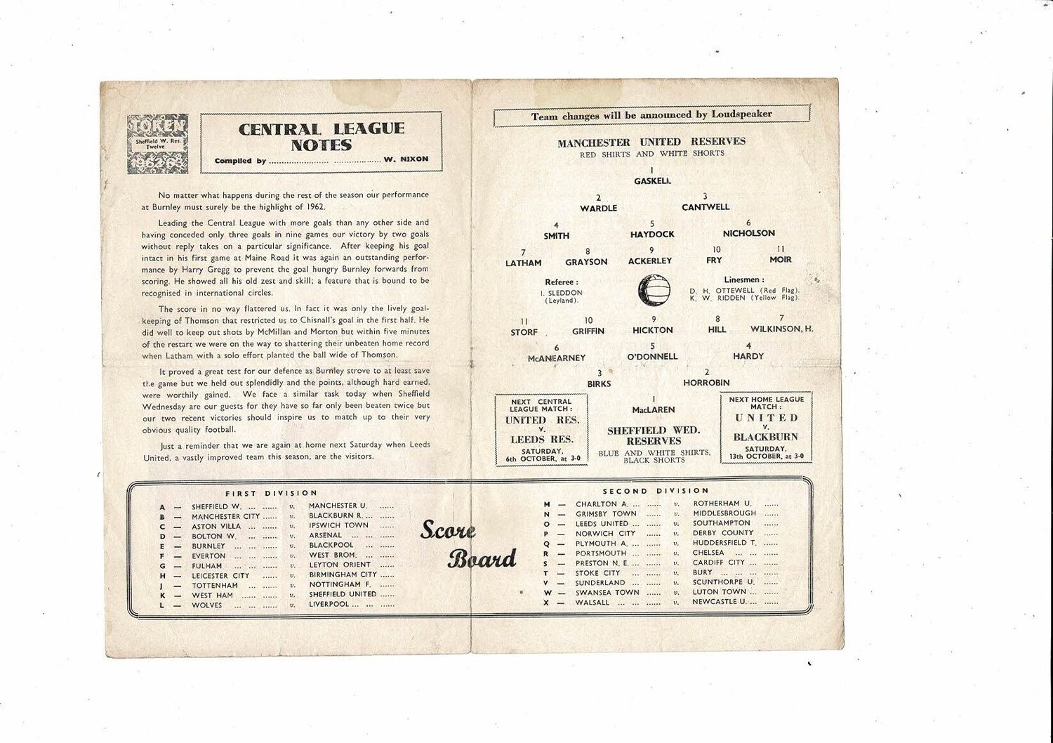 Manchester United v Sheffield Wednesday Central League Programme 1962/63