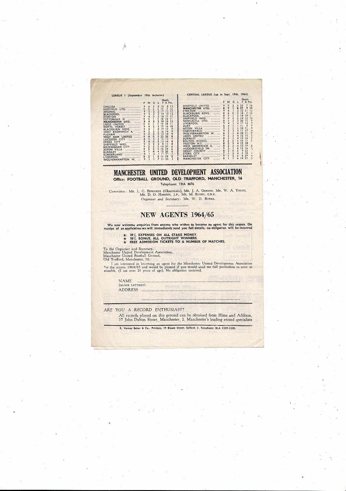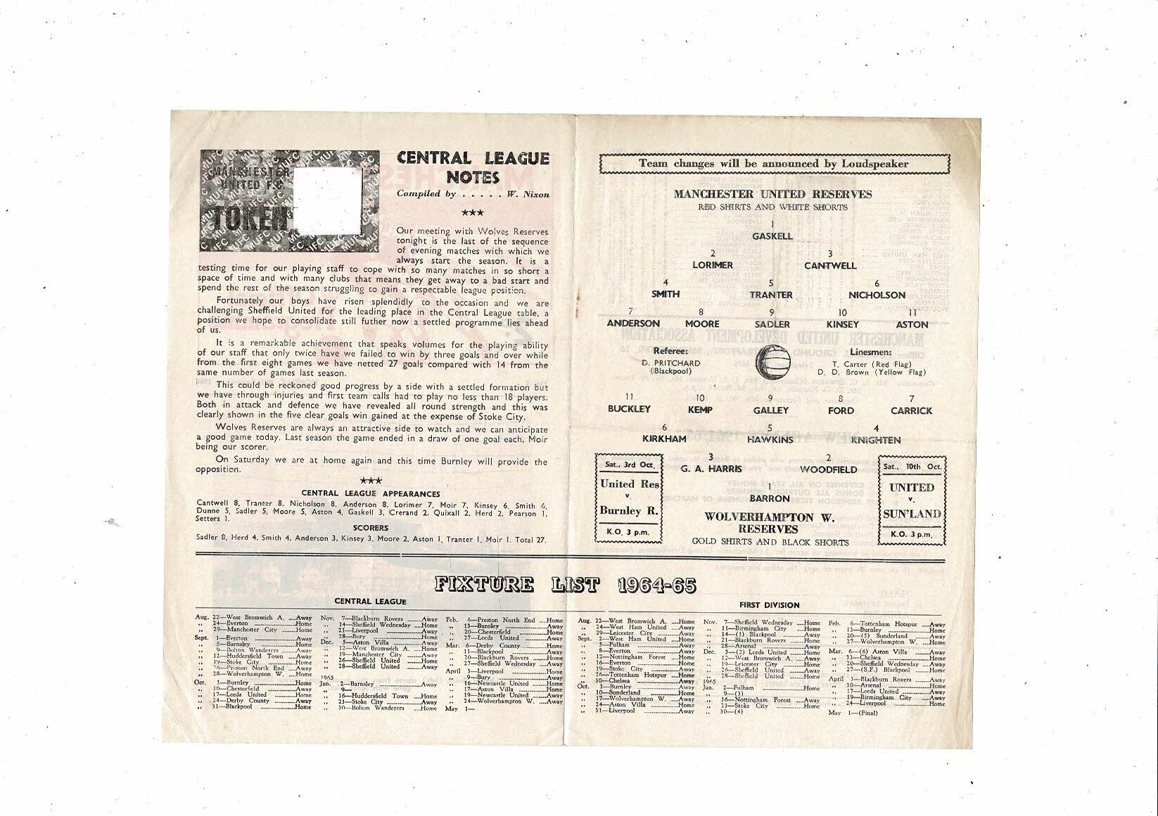 Manchester United v Wolves Central League Football Programme 1964/65