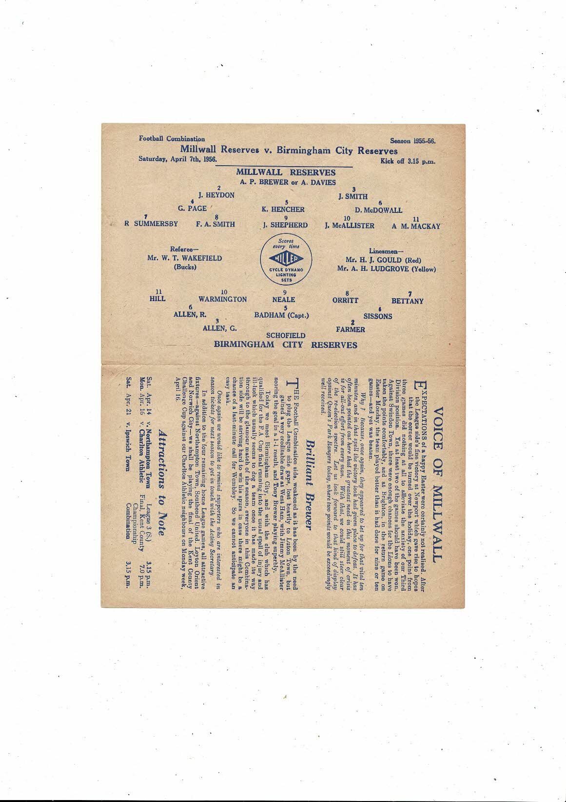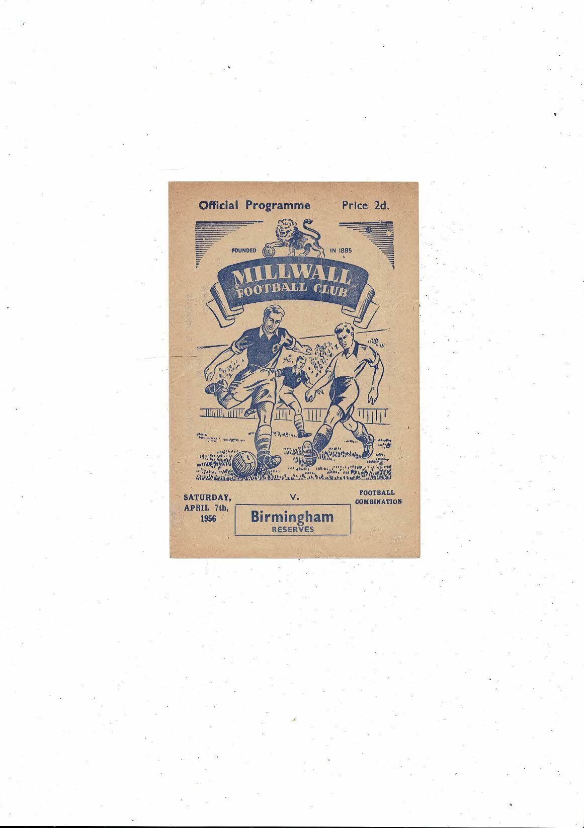 Millwall v Birmingham City Football Combination Programme 1955/56